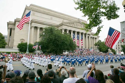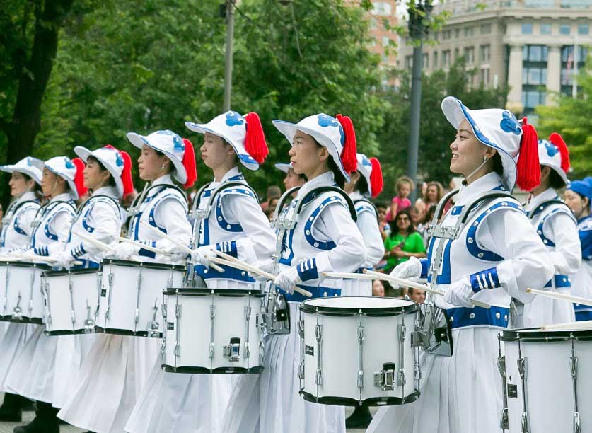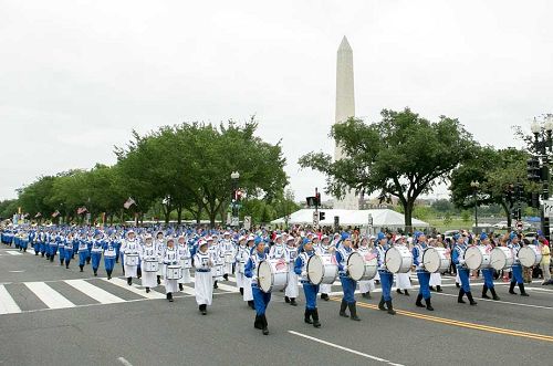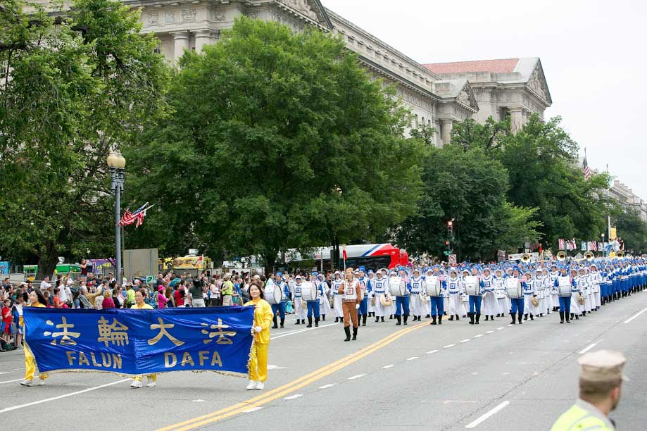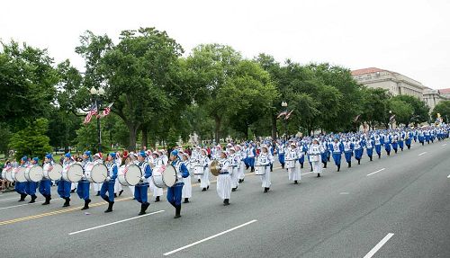 这是法轮功学员第十四次参加美国首府独立日游行,也是由法轮功学员组成的天国乐团第十一年参加该游行,天国乐团指挥周文文表示:“我们希望把音乐和法轮大法的美好带给今天的观众,不管他们是哪一国人。我们希望把和平与美好带给大家。”