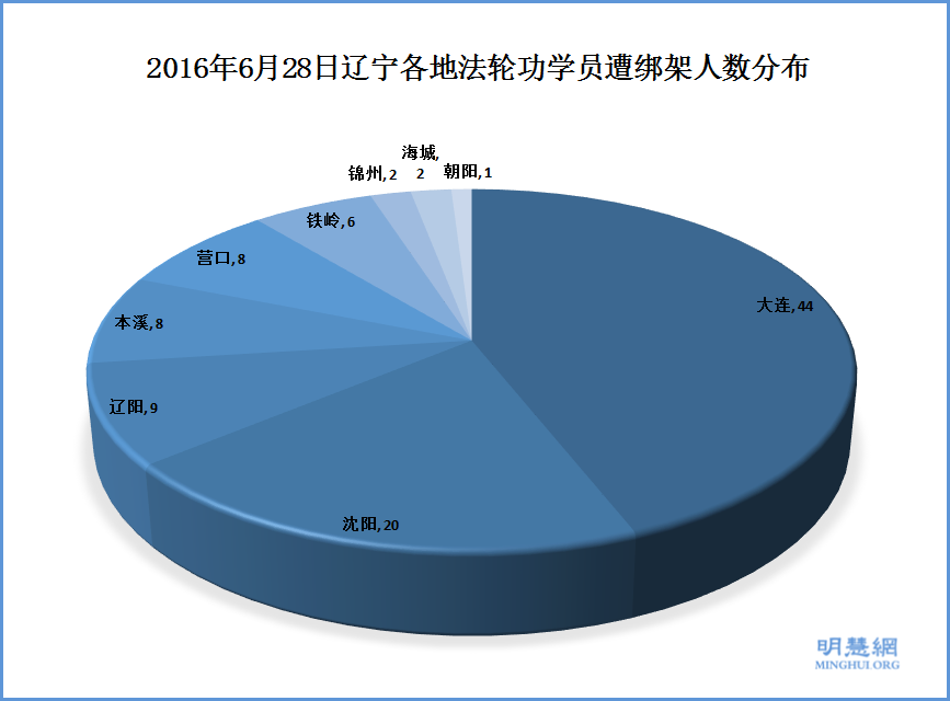 | 大连 | 44 | 刘艳萍(女)、张姓(女)、刘亚州,迟莲珠、宋世娟、周贵玲及女儿、王常荣和儿子、赵新丽、盛洁、王新莲夫妻、陶玉珍、张淑旭、王闯、孙彬、周杰、李姓、仲淑娟及丈夫和女儿,一男一女两位法轮功学员、王秀丽、石桂芬、曲连喜,刘姓、王姓,一位女法轮功学员、孙姓、钟家易、肖芳、孔庆春、方彩霞、杨洪涛、王春英和岳母、岳父、邹(或周)姓女学员 |