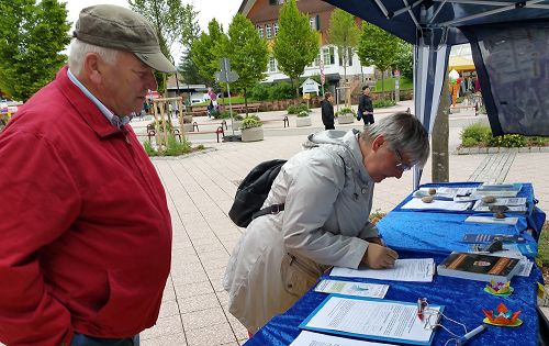 德国Arthur先生在征签簿上签完名后说:现在这个世界上很多人,只知道赚钱,不关心他人,不分真假善恶,这是很危险的。我希望,我的支持能对你们反迫害有所帮助。