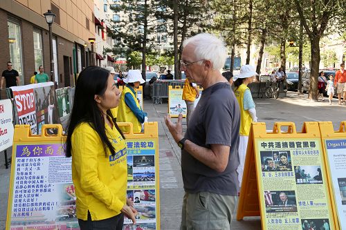 ![]() 图1-3:七月三十日,法轮功学员在渥太华市中心最繁华的拜沃德市场(ByWard Market)前,通过展板、横幅以及向主流社会曝光发生在中国的活摘法轮功学员器官的罪恶,许多民众驻足了解真相。 |