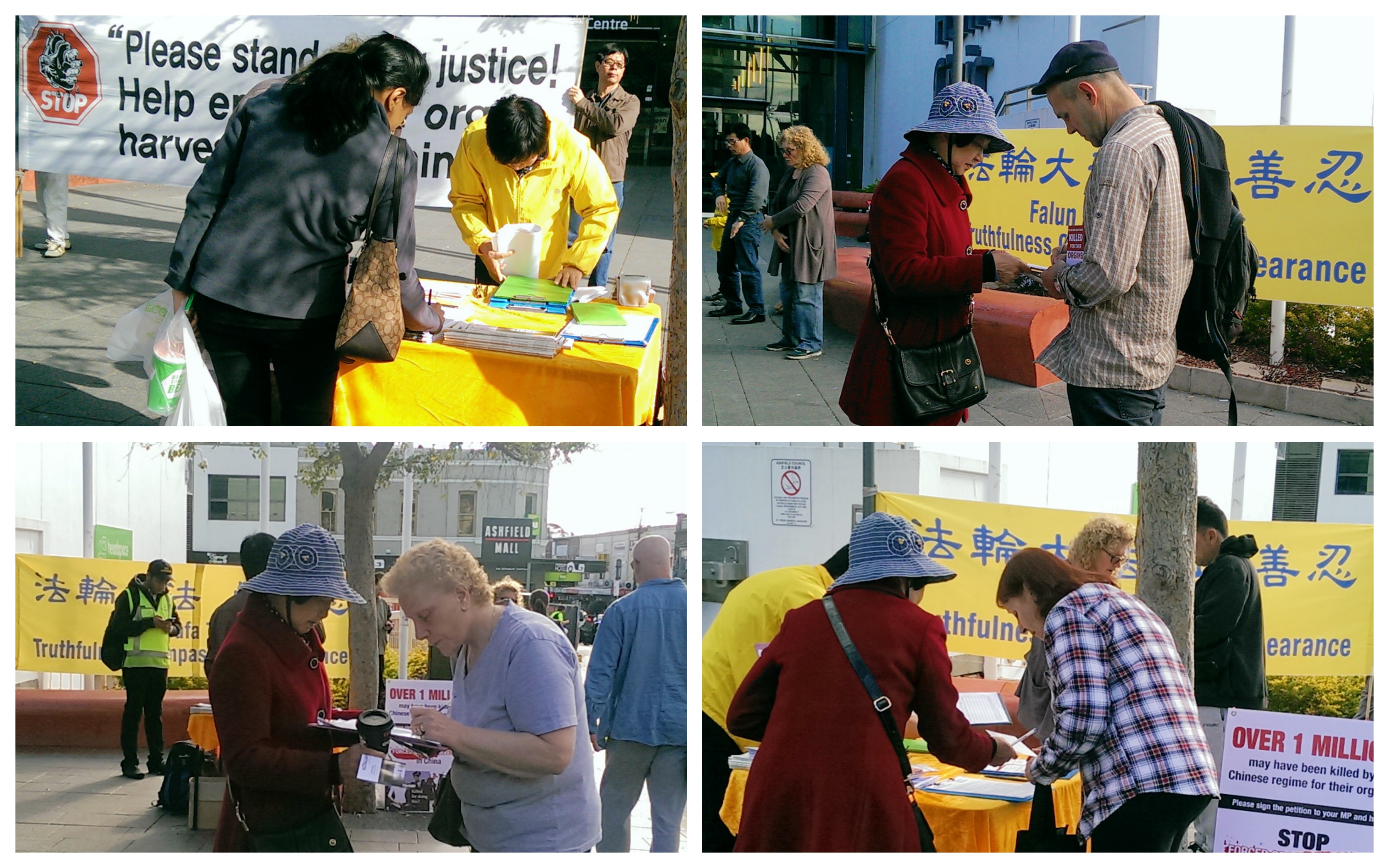 Ashfield 区的市民 Grace 表示她早就对中国的活摘器官暴行有了解,她说:“这是非人性的,是反人类的,令人难以置信,绝对不应该发生的。然而它发生了,这让人感到万分痛苦,了解到这些我内心产生非常非常强烈的痛苦感。当我第一次听到这些事情的时候,我哭了。我知道这些人只是炼功打坐,我也会打坐。我了解过很多,我知道他们是好人。”她鼓励学员去找媒体曝光这件事情,临走她拿了活摘器官的中英文资料,她说要把这些资料送给她的家庭医生,因为他是个中国人,应该了解真相。