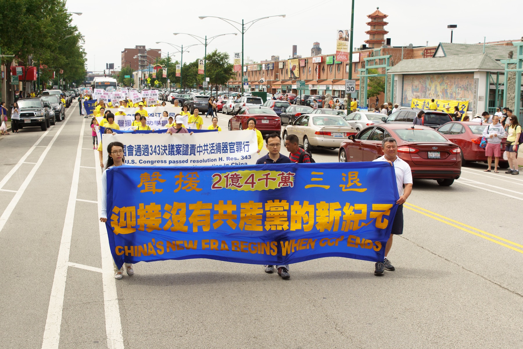 随后的“声援三退”(三退指退出中共的党、团、队组织)和“控告江泽民”方阵则以“声援2亿4千万人三退”“中共不等于中国 爱国不等于爱党”“法办迫害元凶江泽民”等横幅呼吁华人民众看清中共历史,摆脱中共思想奴役。数十个横幅与写有“退党”“控告江泽民”的手举牌连成一片,整个游行队伍绵延数个街区。
