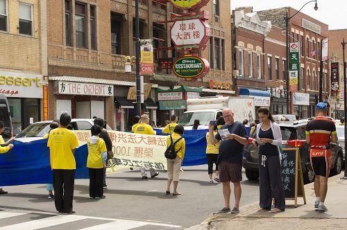 游行中打出的揭露中共活摘罪行的真相,震撼了很多观看的民众。“哇,太吃惊了!活摘器官这种罪行正在发生,而我竟一无所知。”居住在芝加哥北区林肯公园的Brian Hile到中国城观光,恰逢美国中部各州的法轮功学员汇聚在此游行炼功,他深受触动。Hile先生站在芝加哥中国城的主街Cermak上,目不转睛地看着缓缓走过的法轮功游行队伍,“我从未想过今天仍有这种事情发生,强摘器官、共产党迫害等。”Hile曾经是豪华酒店Fairmont Hotel的全球销售中西部主管,两年前刚退休。他说:“希望能有更多这样的(法轮功游行),引起更广泛的关注。”