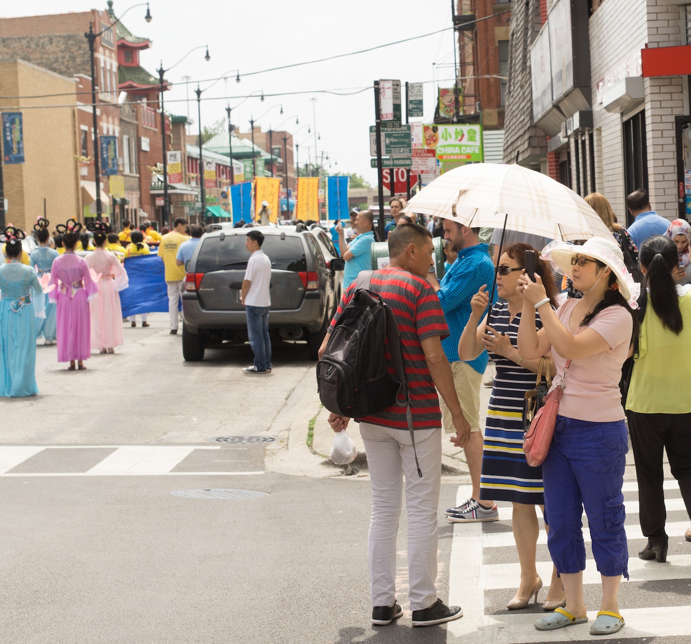 ![]() 图15-16:芝加哥中国城的游行吸引路人驻足观看,拍照 |