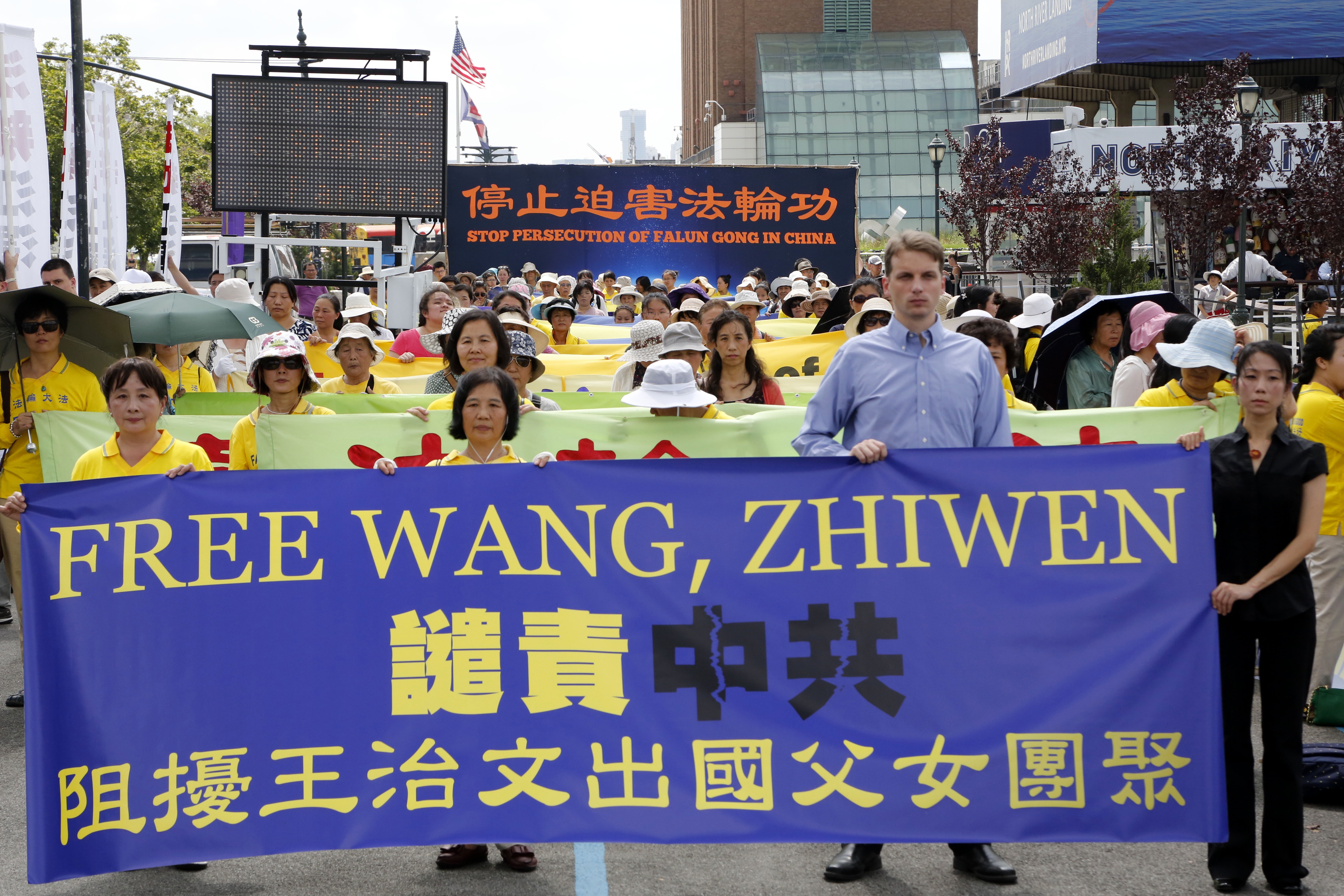 ![]() 法轮功学员二零一六年八月十一日在纽约中领馆前呼吁营救王治文 |