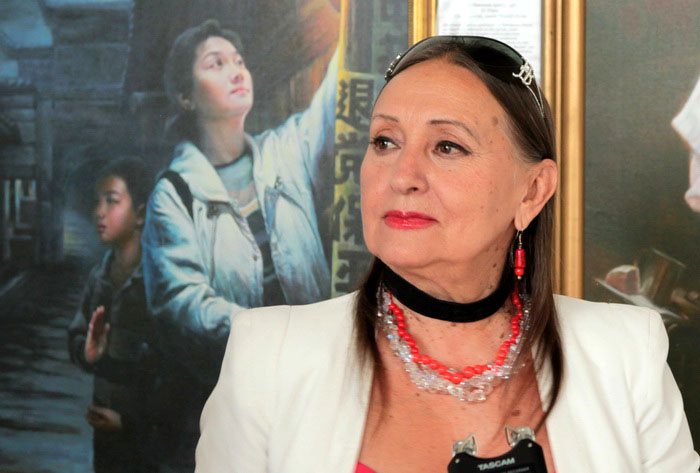 ![]() 乌克兰谢弗琴科大奖得主拉里萨·卡多奇尼科娃观看完画展后接受采访 |