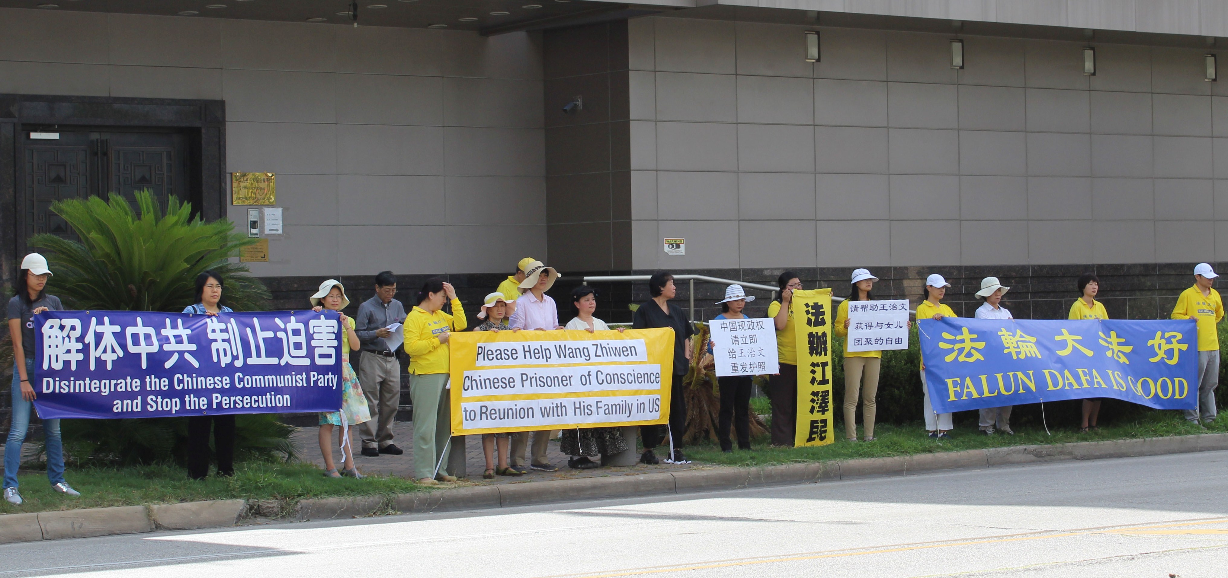 休斯顿部份法轮功学员在中领馆前举行抗议活动,要求中共现政权立即给王治文重发护照 |