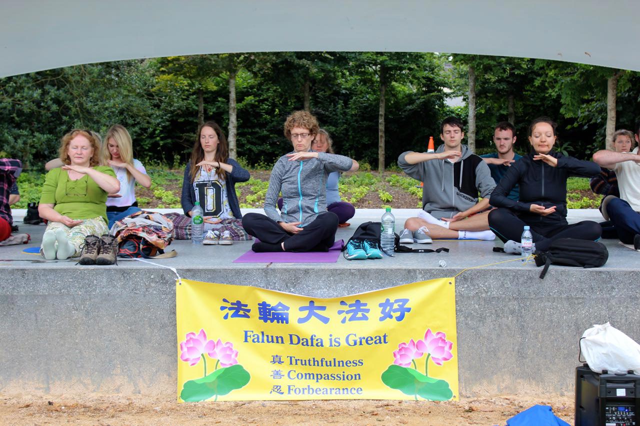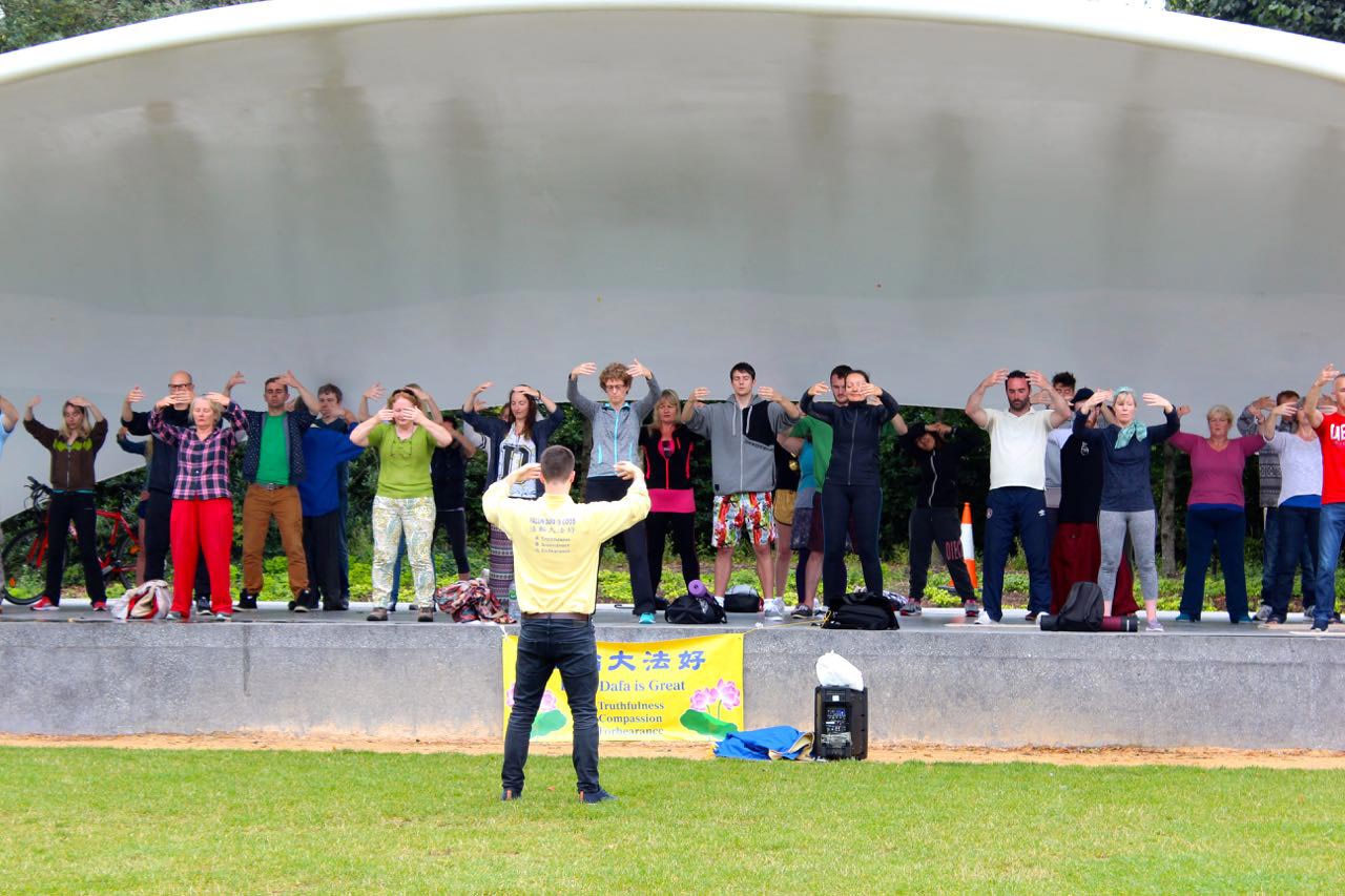 很多人都表示很感兴趣,想学。周六教功那天,五名法轮功学员分别从都柏林和堤坡拉瑞来到科克,有大约五十名爱尔兰人参加并学习了五套功法。