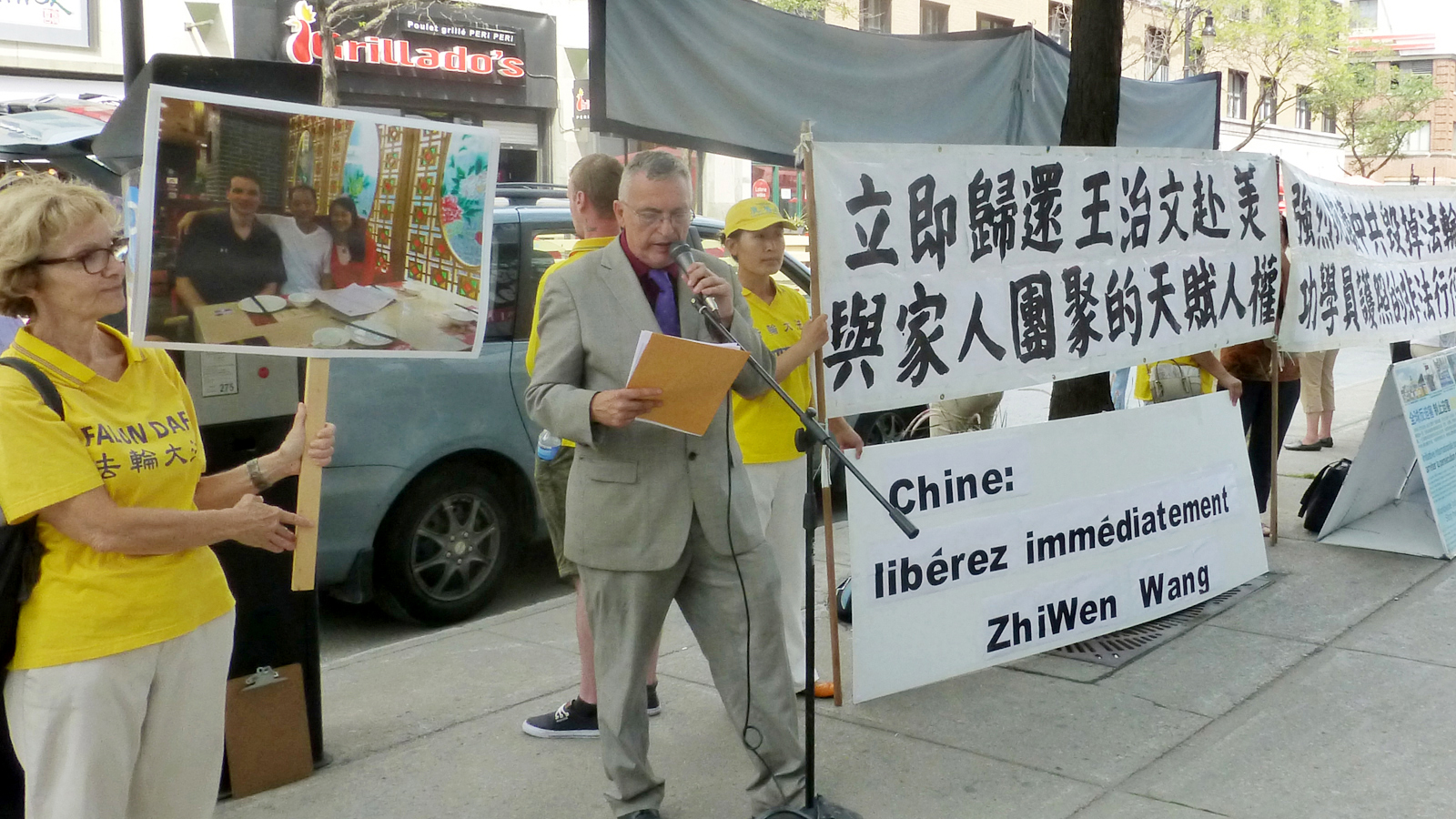 在蒙特利尔中领馆门前集会上,法轮功学员魏先生表示,中共当局必须立即停止迫害法轮功,立即停止活体摘取法轮功学员器官的罪恶行径,立即释放所有被非法关押的法轮功学员,强烈抗议中共毁掉法轮功学员护照的非法行径,并要求立即归还王治文赴美与亲人团聚的天赋人权。