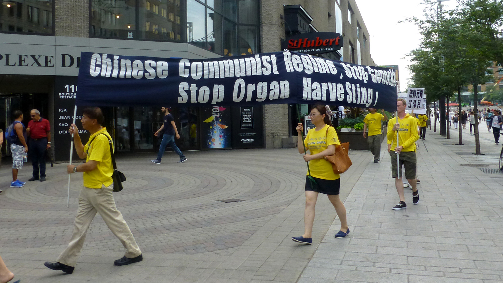 ![]() 参加集会的法轮功学员手举展板与横幅,穿过蒙特利尔最繁华的圣凯瑟琳大街与唐人街 |