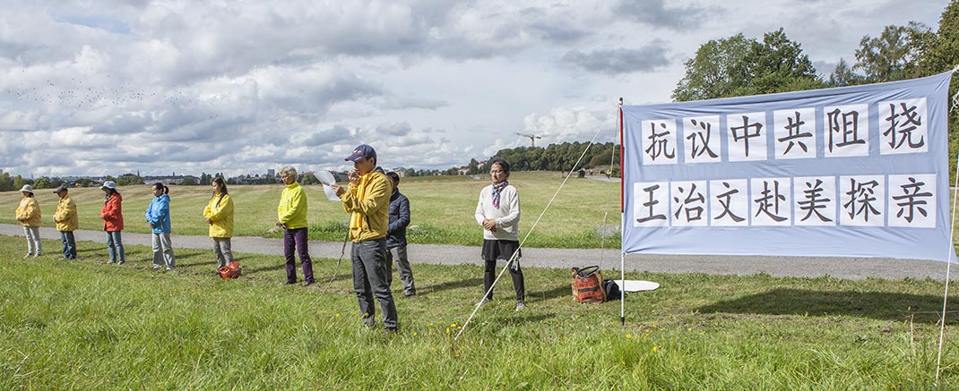 ![]() 图1、瑞典法轮功学员中使馆前抗议中共阻挠王治文赴美与家人团聚 |