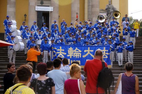 在埃格尔市政厅前的广场上,Valiena为天国乐团的演出鼓掌。她高兴地说:“天国乐团给我留下了非常正面的印象。他们的理念‘真善忍’让我觉得太棒了,不论对哪个国家的人。”
