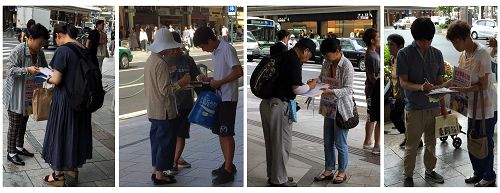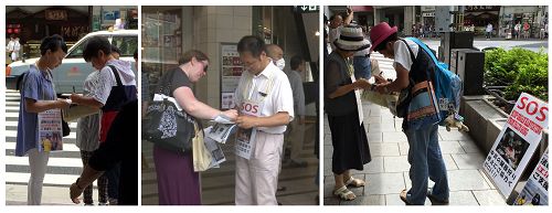 来京都旅游的,除了中国游客外,还有来自欧美国家,也有来自亚洲,如韩国,台湾及香港等地的。许多游客在接到真相传单或看到展板的内容后马上在征签表上签名。不少游客表示,这样的事情(活摘)绝对不能再持续下去了,必须马上予以制止。