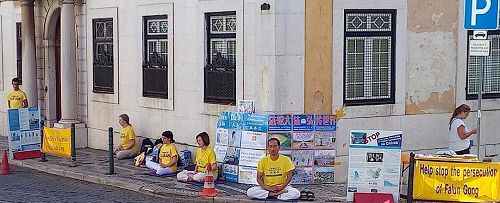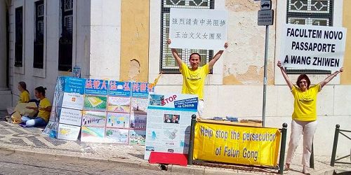 ![]() 图1-3:葡萄牙部分法轮功学员在里斯本中使馆前举办和平抗议,声援王治文。 |