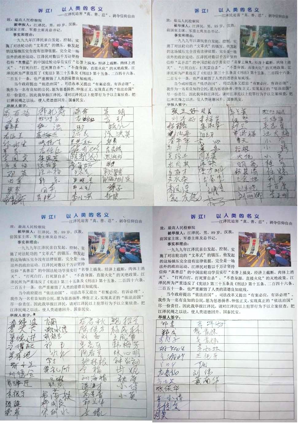 一位当过村长的老太爷说:“举报江泽民,我一定支持,一定签真名。” 一个五十多岁的农妇说:“我不会写字,我报名字,你帮我签。”