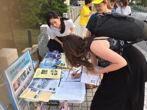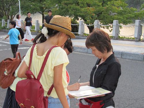 有位小伙子看完传单后同情的说:“对无罪的人进行杀戮、虐杀,就是希特勒当时历史的再次重演。”他在征签表上签了名之后连声向学员道谢。有位女士签完名之后表示:“这纯粹就是迫害,而且这种迫害整个都是倒行逆施,与和平理念完全背道而驰,所以诉江一定要继续努力。”有位男士不但自己签名,还告诉其他民众:“法轮功学员说的都是真的,如果在这种情况下我们还不能做出选择的话,那就是我们日本国民对人权的意识太低了。”
