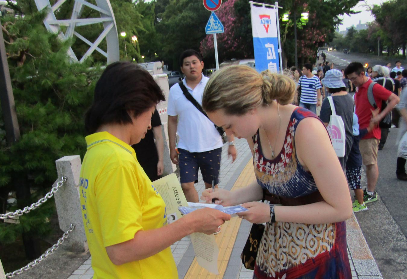 当天正值摄氏35度以上的高温,虽然汗流浃背,人们却顶着炎炎烈日驻足阅读法轮功的真相传单,观看真相展板和横幅,倾听法轮功学员讲述发生在中国的迫害,并纷纷署名加入和声援“诉江大潮”。
