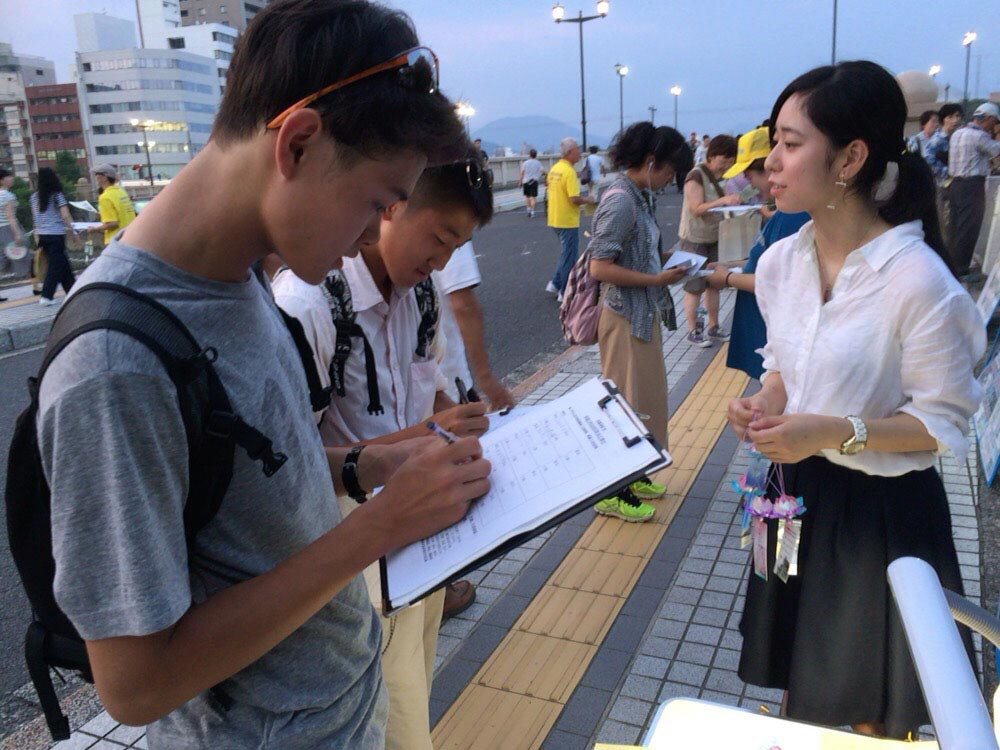 图:日本法轮功学员在广岛核爆七十一周年日来到广岛和平公园,向来自世界各地的民众揭露中共活摘法轮功学员器官的罪行,并征集签名声援诉江。 |