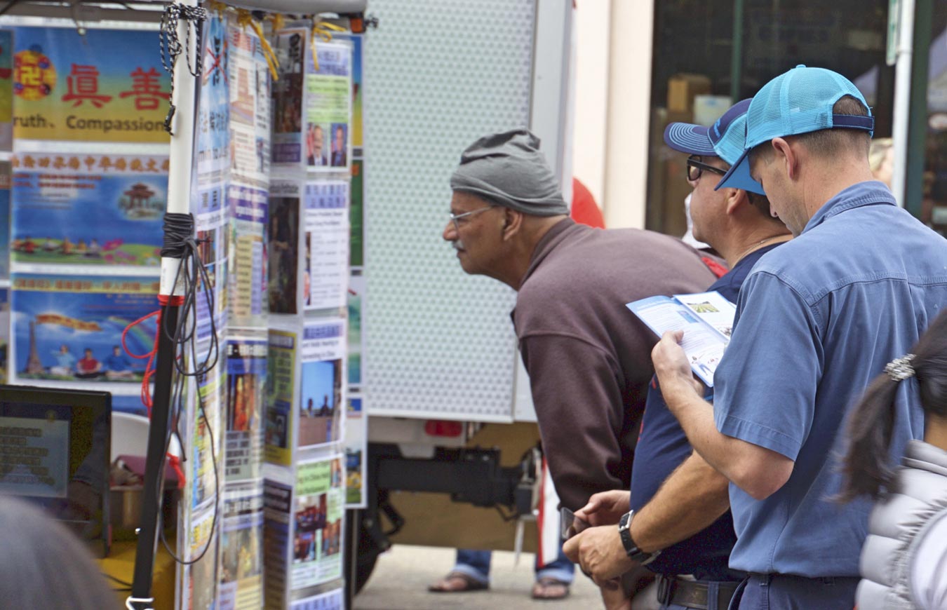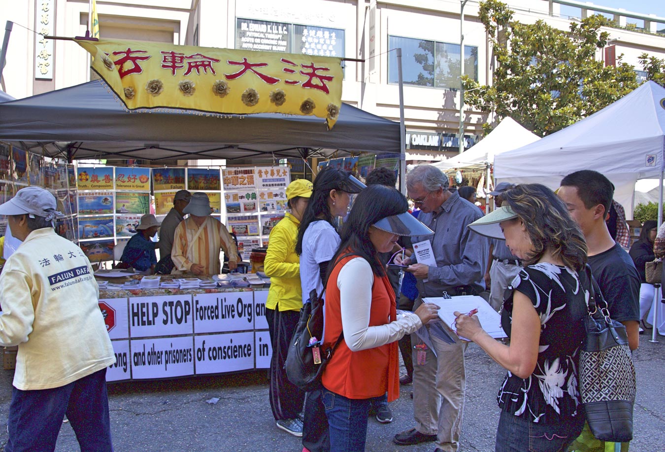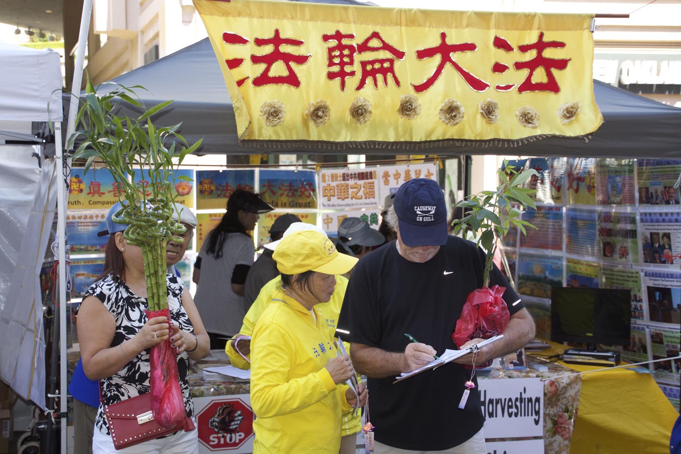 在两天的街会中,法轮功学员在展位上展示了法轮功弘传世界,揭露中共酷刑迫害法轮功学员、活摘法轮功学员器官的真相图片,并征集签名制止中共活摘。众多人,包括华人认真倾听学员讲述真相。听到中共大规模活摘法轮功学员器官,人们感到非常震惊,认为这是不能容忍的邪恶,这是不可饶恕的罪行,所以许多人主动要求签名支持法轮功学员,他们认为,这种罪恶要立即被制止。