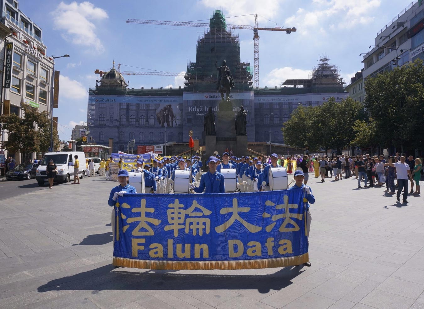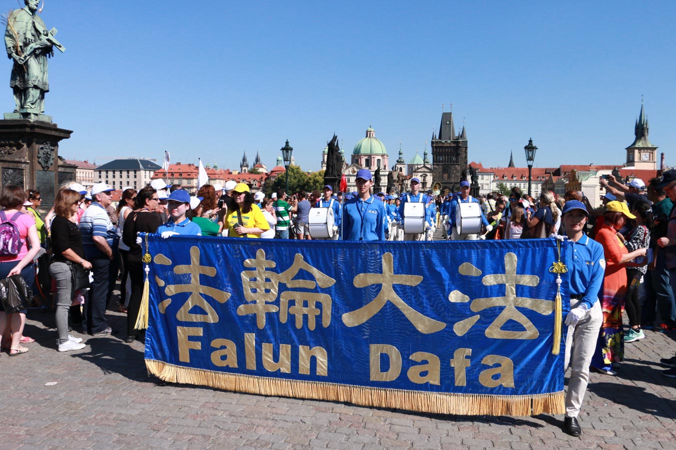 当游行队伍经过这些广场时,学员用捷克语和中文告诉人们法轮功是中国传统的修炼方法,教人遵循“真、善、忍”的原则。但因为以江泽民为首的中共政权惧怕上亿民众拥有自己的信仰,按照“真、善、忍”做好人,在一九九九年七月开始了对法轮功学员的残忍迫害。不仅将他们非法关押在劳教所、监狱,酷刑折磨他们,甚至还活摘他们的器官牟利。