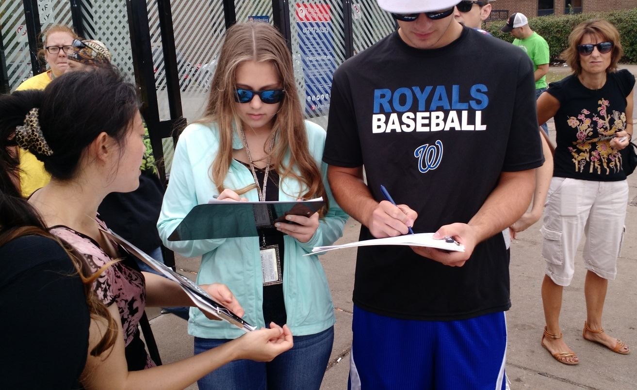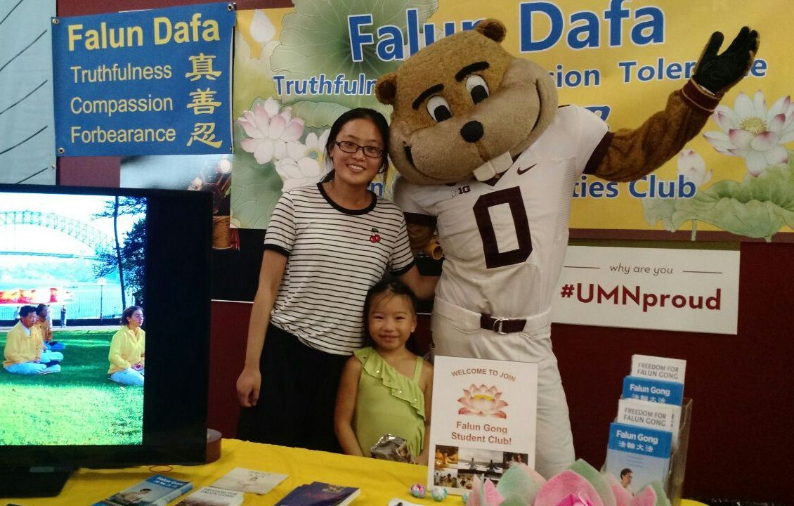 明尼苏达大学的吉祥物金地鼠(golden gopher)也跑到法轮功的摊位,开心地和学员合影。
