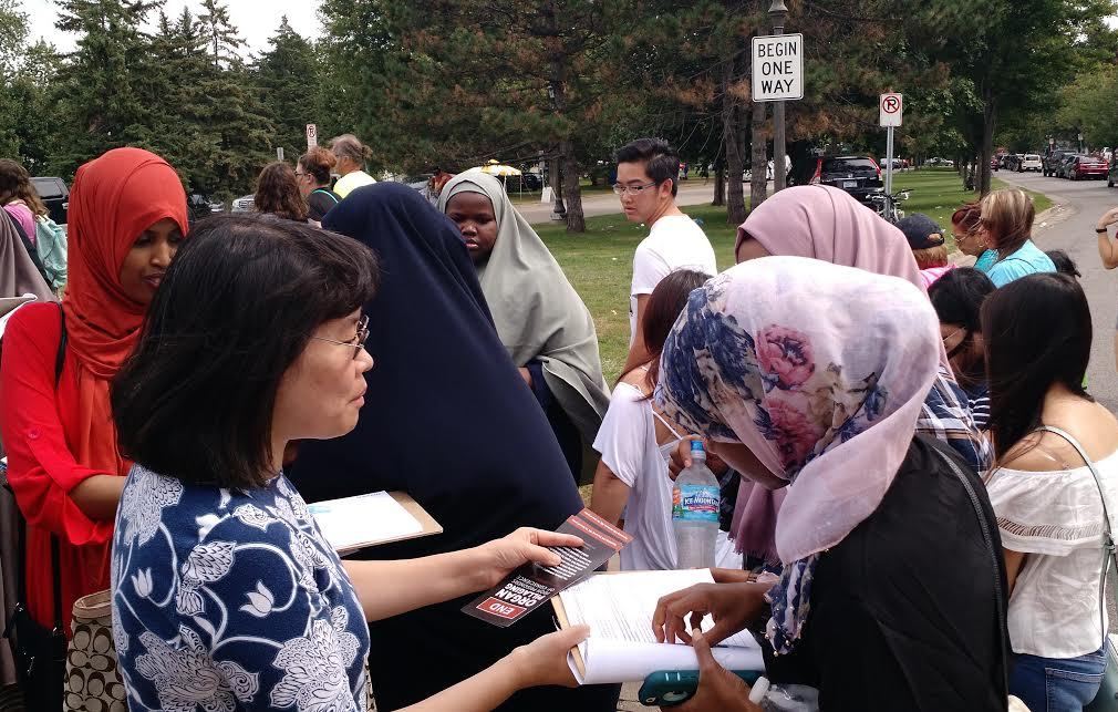 明尼苏达州的法轮功学员们在集市内设展位,走上街头征签,接触广大的人群,传播法轮大法的真相,并告知民众中共恶党对法轮功的残酷迫害和活摘法轮功学员器官的暴行。一万五千余人签名反活摘,反迫害。