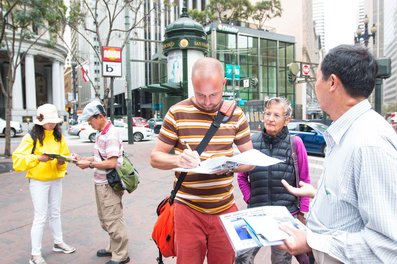 【明慧网二零一六年九月十二日】九月十一日,旧金山法轮功学员利用双休日走上街头,向民众征集签名,呼吁制止中共活体摘取法轮功学员器官的罪行,获得民众支持。