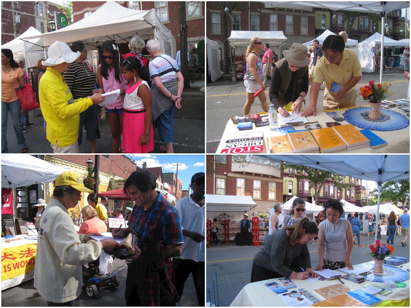 图1:法轮功的展位总是有很多游客驻足和学员们交谈,了解真相