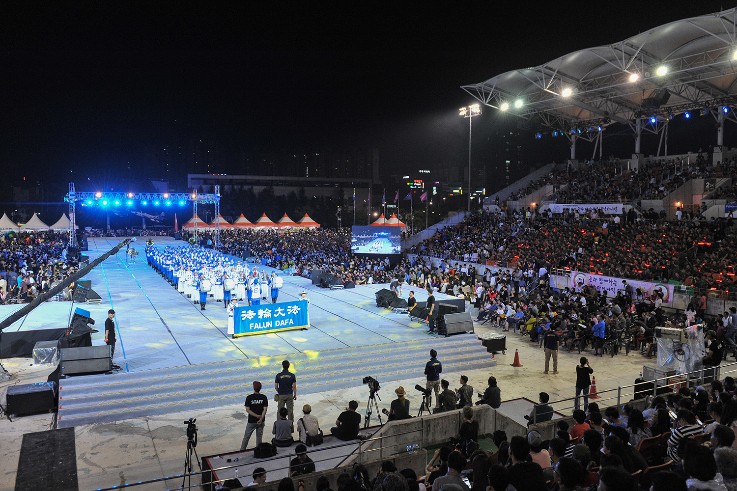 九月十日,韩国天国乐团参加了该庆典。从傍晚六点三十分开始在元一路展开的庆典游行,身穿蓝白相间唐装的天国乐团格外醒目,他们演奏了《法轮大法好》、《神圣的歌》等曲目,受到观众们的热烈欢迎。主持人介绍说,天国乐团是法轮大法学员组成的军乐队,建立十一年来在全国各地参加了各种文化庆典,对地方文化发展很有贡献。