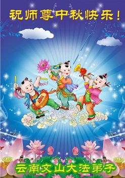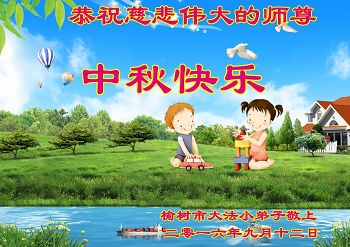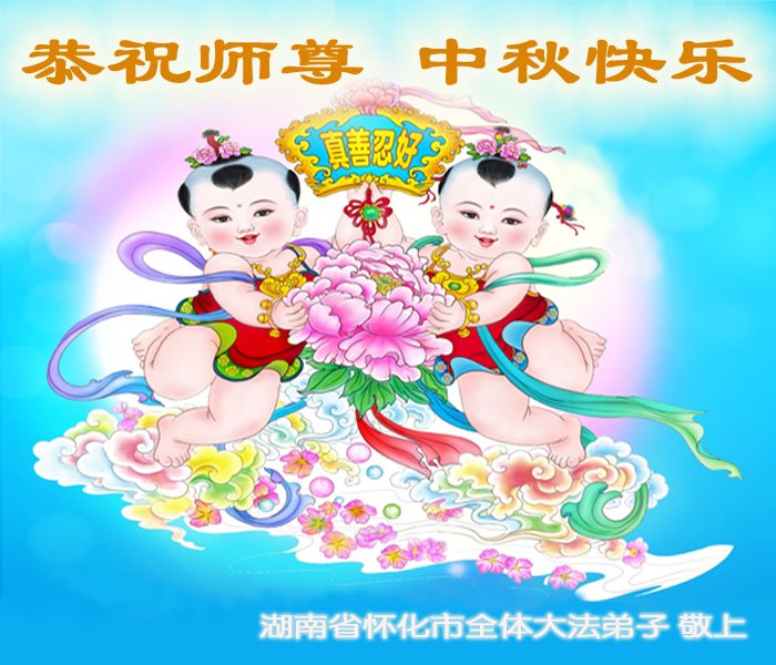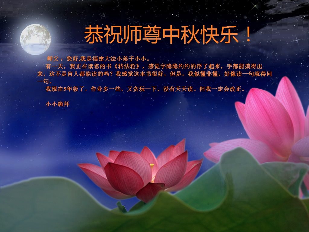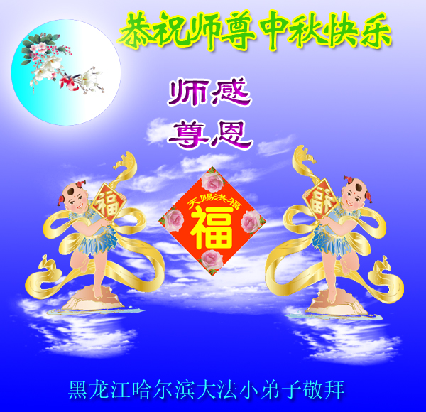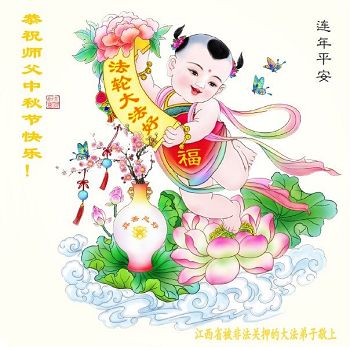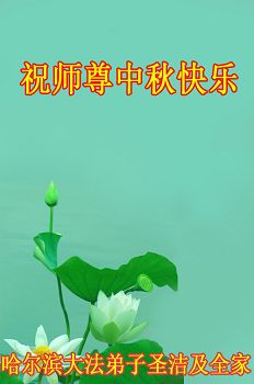 师父,在修炼这条路上,弟子走的是跟头把式的。由于不会修炼,家庭被邪党拆散,但是我儿子一直健康的成长着。我知道师父一直在看护着孩子,弟子感恩不尽。孩子虽没有走入修炼,但已明白真相,更希望师父能帮他戒掉网瘾,走入修炼。孩子表示非常感谢师父的慈悲呵护,恭祝师父中秋快乐!