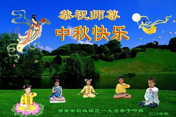 广东省梅州市一家四口大法弟子及全家二十多人恭祝李洪志师父中秋快乐!