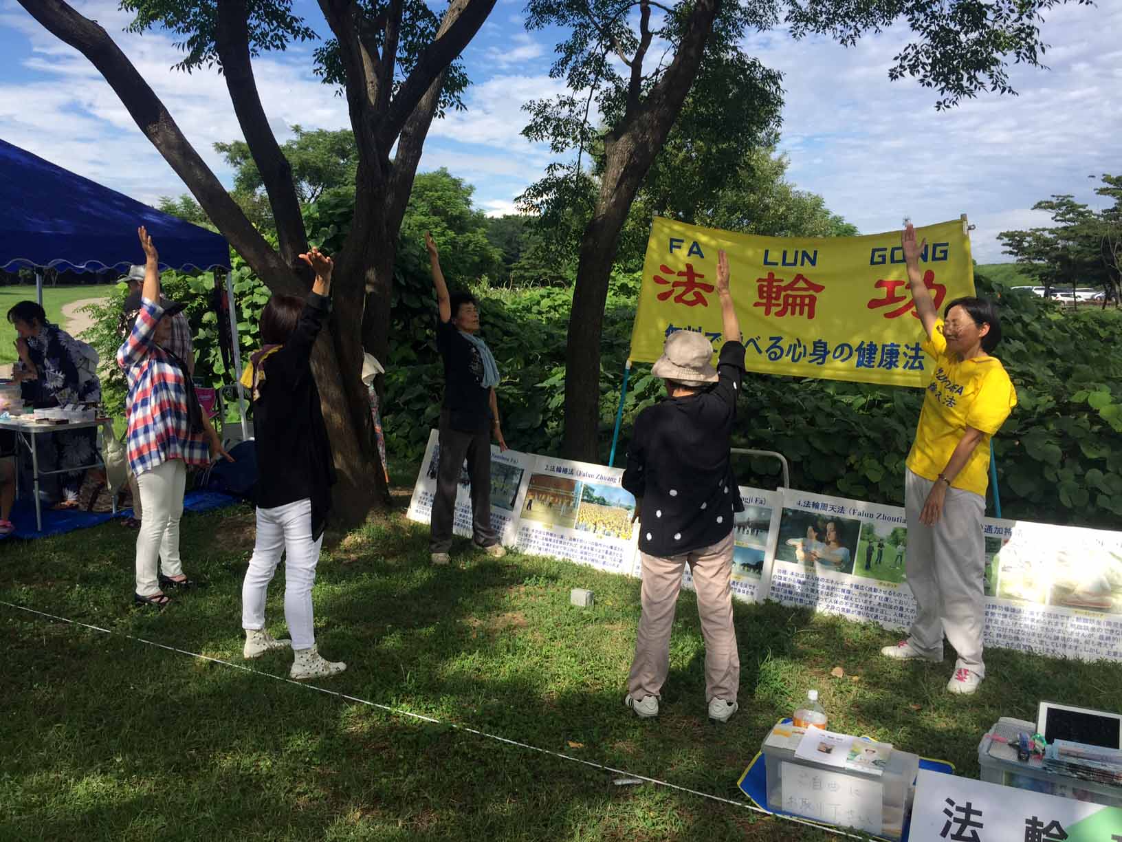 ![]() 图1-2:在稻泽夏季活动节展位上学炼法轮功的市民们 |