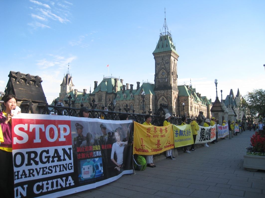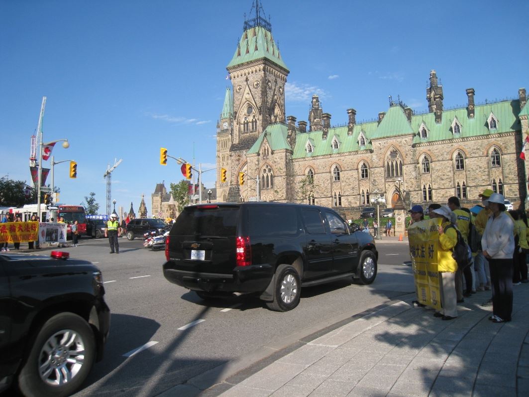 ![]() 图2:李克强一行在前往国会山与加首脑会晤途中路遇法轮功队伍 |