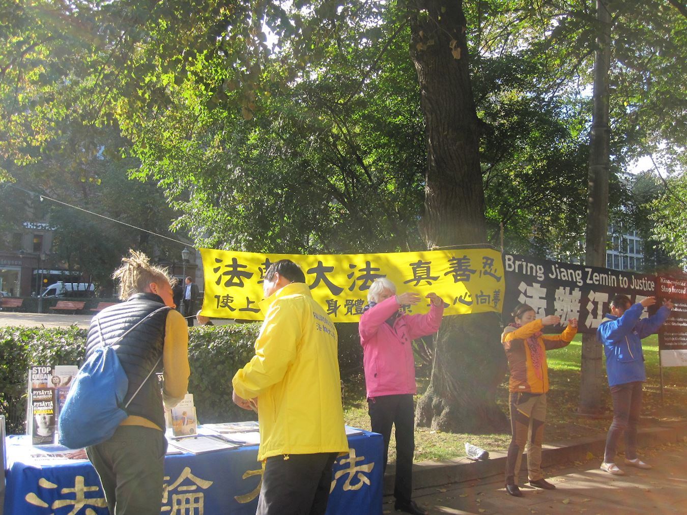 在芬兰议会、总统府和总理府附近抗议期间 每次当张德江等随从车队抵达时,学员高喊“法轮大法好”、“法办江泽民”,途经的路人和骑自行车的人们都驻足观看横幅,他们明白后马上竖起拇指以支持抗议活动。