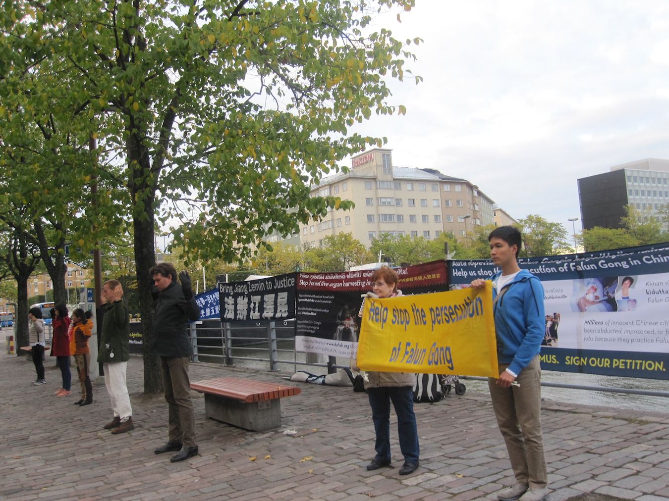 '图:芬兰法轮功学员分别在议会、总统府、总理府附近,举横幅和平抗议活动'