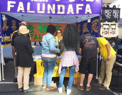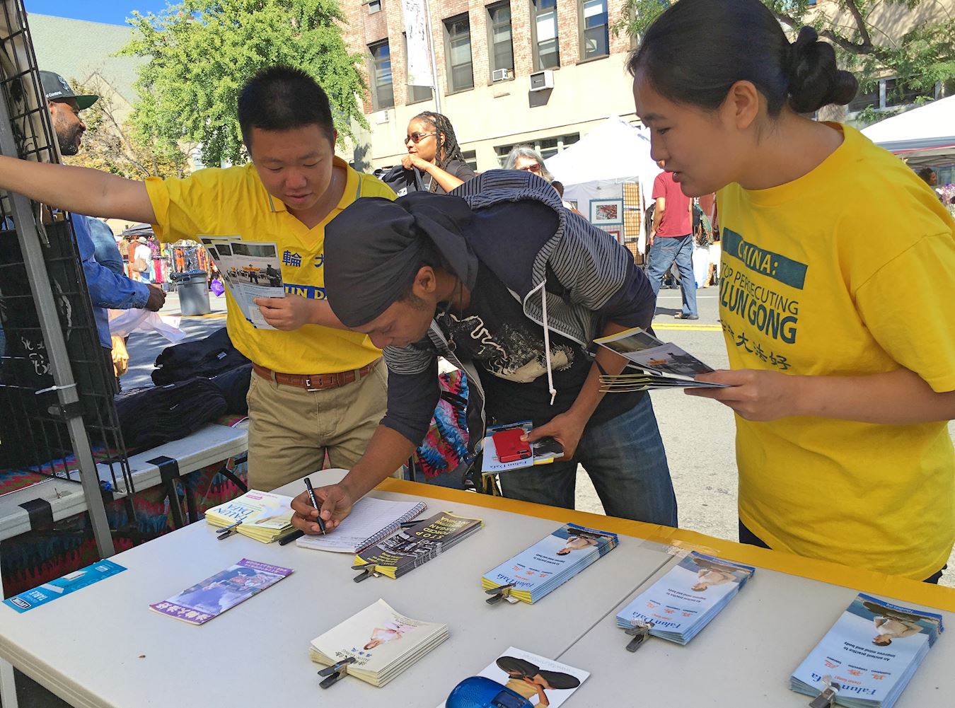 虽然布鲁克林的大集市一年只有一次,但是法轮功给民众留下了深刻的印象。有一位西人女士在人群中喊道:“我每年都会来要一朵法轮功的小莲花挂在家里,我感到这个小莲花可以给我能量!”一位叫做Matthew的先生同他的朋友们一起直奔展位而来,直接要求签字支持反迫害,他们说他们了解一切真相。
