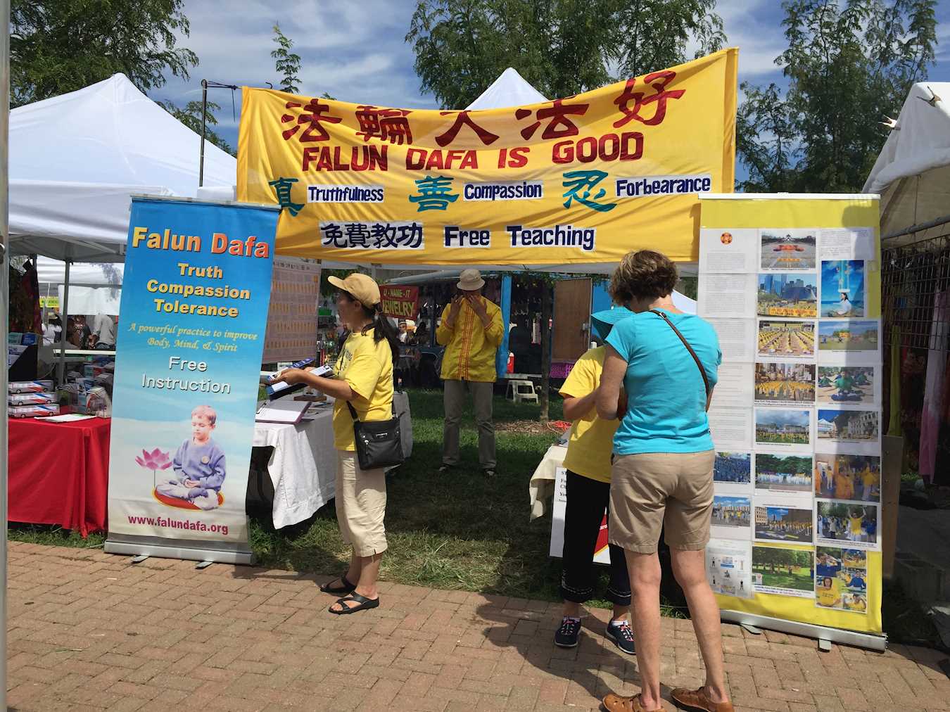 图1:二零一六年九月二日至五日,美国肯塔基法轮功学员在路易维尔市世界节(World Fest)上设立展位,向民众传播法轮功的真相。 |