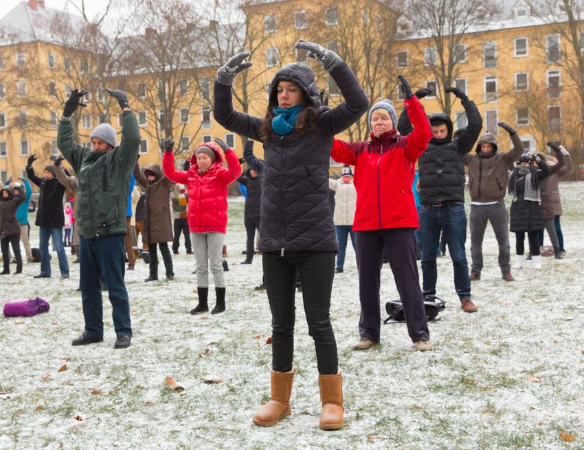 图4~6:法会期间中西方法轮功学员们雪中集体炼功