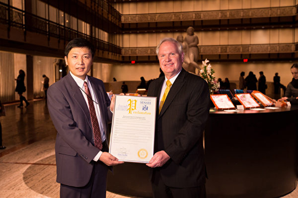 ![]() 图10:在纽约神韵晚会首演当晚,一月十一日晚,纽约州参议员、2017纽约市长参选人艾维乐(Tony Avella)在赶到林肯中心大卫寇克剧院向纽约神韵主办方颁发褒奖。他说:“我很高兴能代表纽约州议会来此致贺。” |