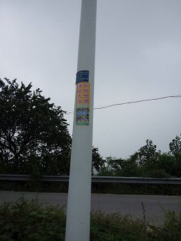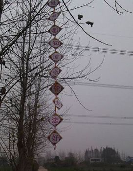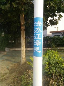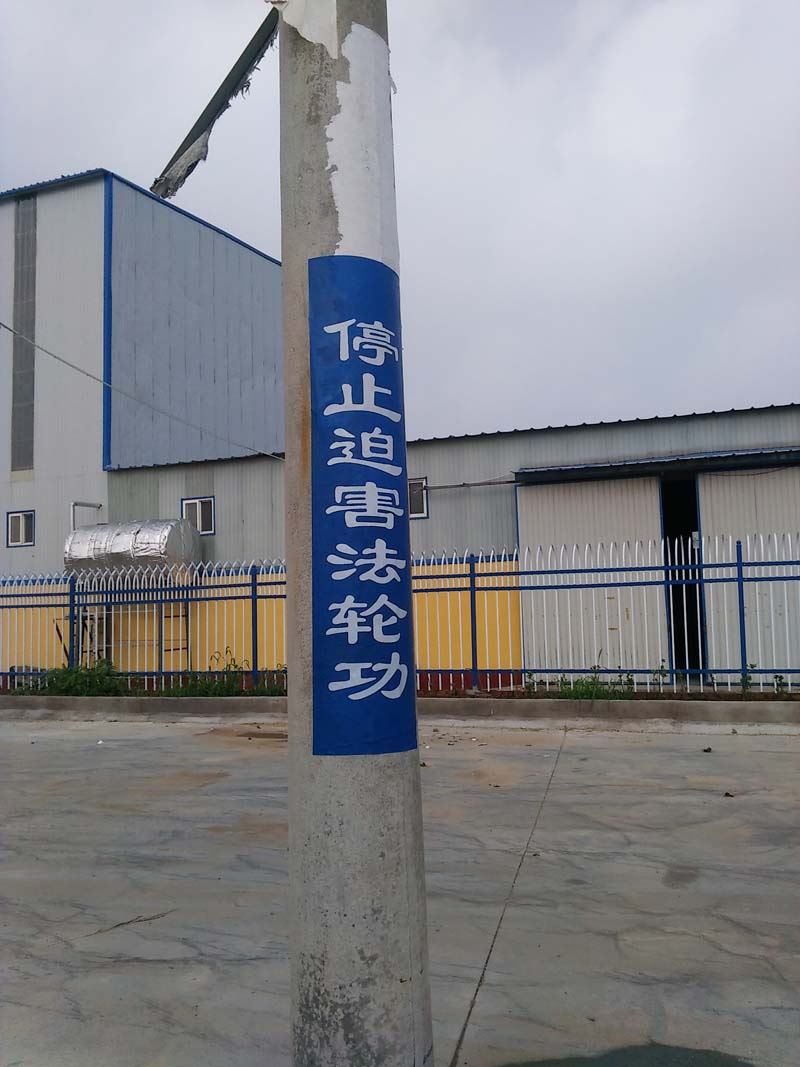 河北省衡水某市从五月十三日世界法轮大法日开始到现在,据不完全统计,法轮功学员们共计挂出真相条幅一万多个,真相展板一千多幅,真相不干胶大中小一万多个。不论走在大公路和田间路上,村子里和胡同里,都能看到电杆和墙上“法轮大法好”、“法办江泽民”等真相信息。有的半年了还在那儿贴着、挂着。