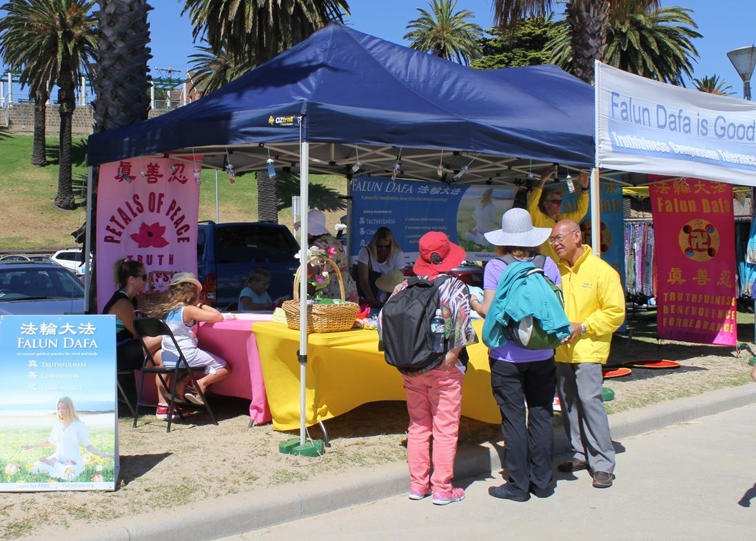 同一天,在距离墨尔本一个多小时车程的著名旅游城市吉朗(Geelong),“法轮大法好”展位为始自一八四四年的澳大利亚最古老的航海节(Festival of Sails)增添了祥和、美好的色彩。法轮功学员周六、周日连续两天在展位上展示祥和的五套功法,除了美丽的纸折莲花吸引了很多孩子们参与,还有各地游客询问法轮功炼功点的详情。