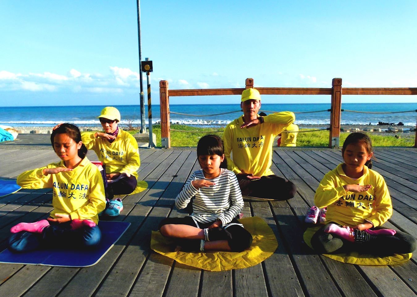 【明慧网二零一七年一月二十四日】二零一七年中国新年来临之际,台湾台东部份法轮功学员齐聚在台东市海滨公园,双手合十向慈悲伟大的法轮功创始人李洪志师父拜年,“恭祝师尊新年快乐!”的声音在太平洋滨直上云霄。法轮功学员展示祥和优美的五套功法,午后阳光普照,金黄色上衣映着蓝天碧海,美丽画面吸引许多游客与民众观看。