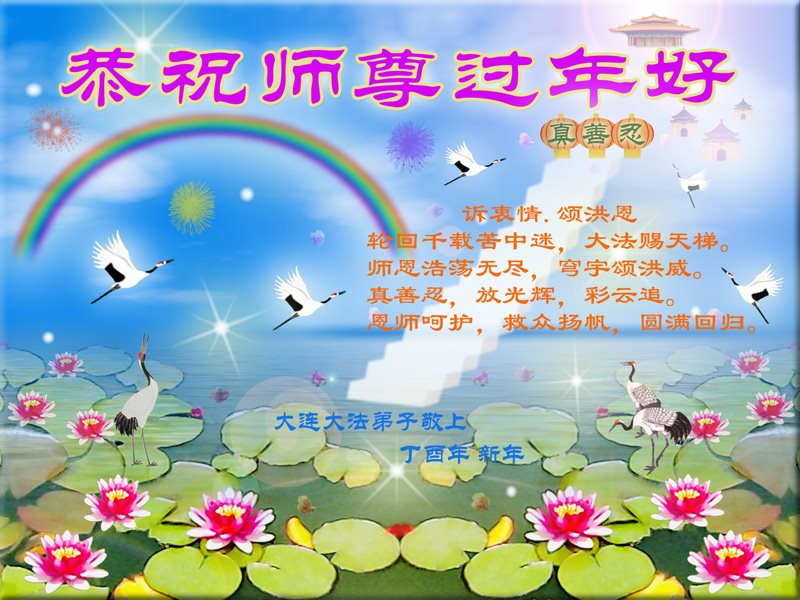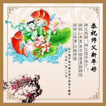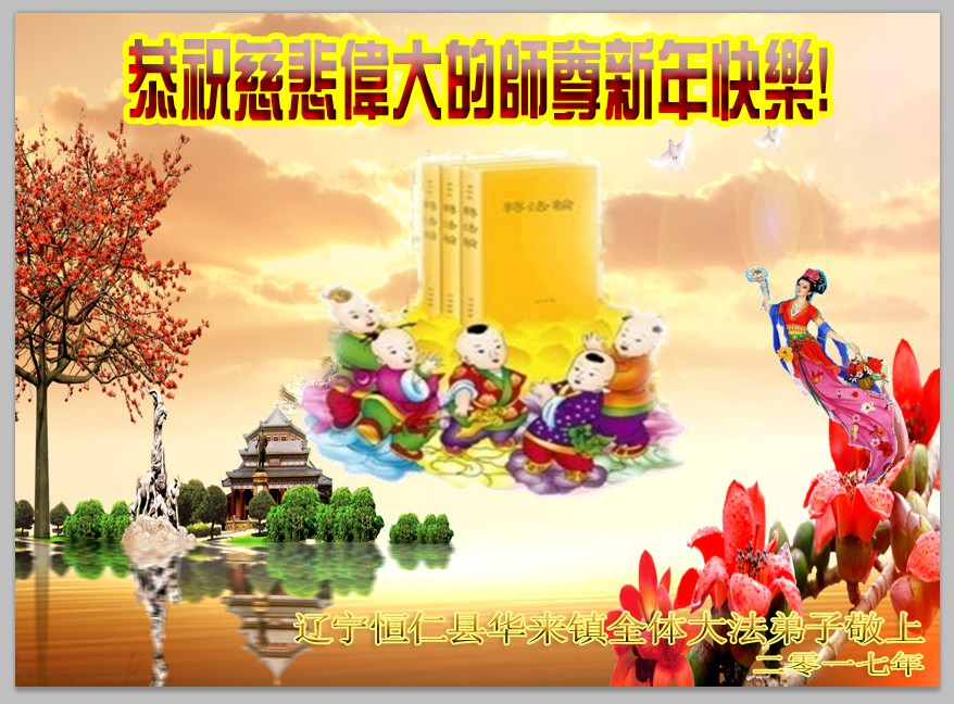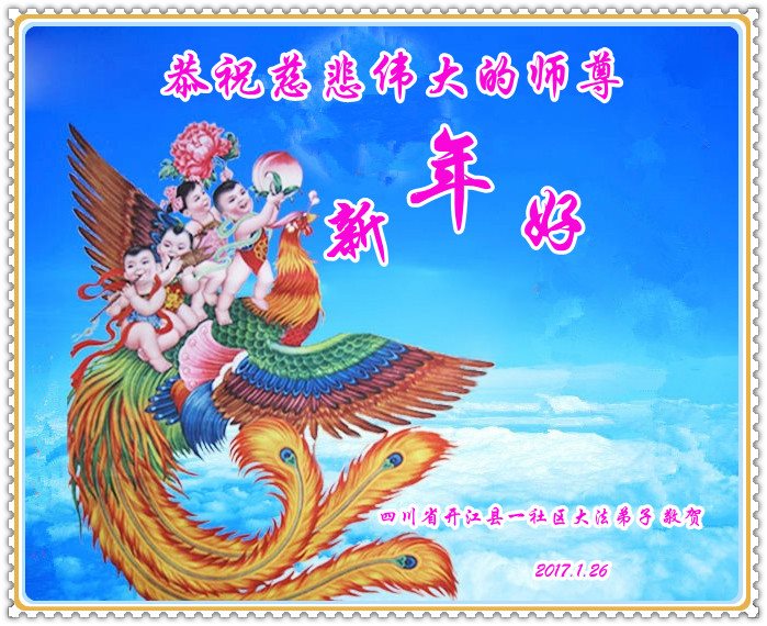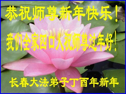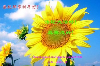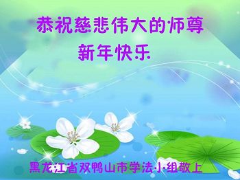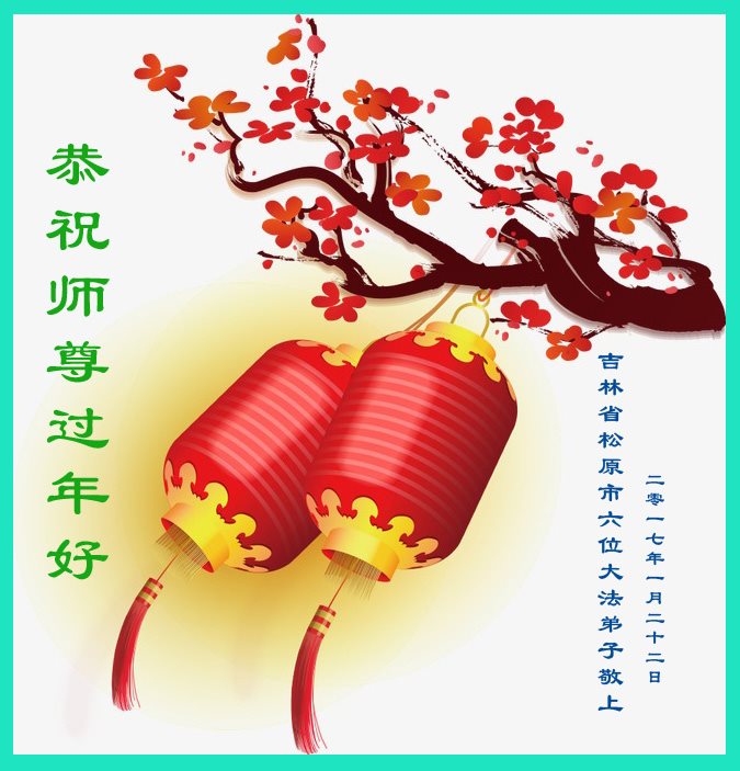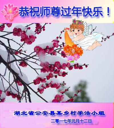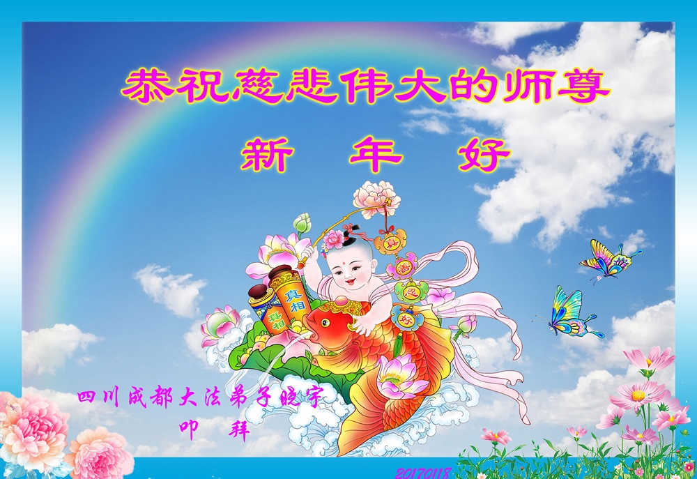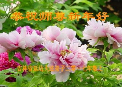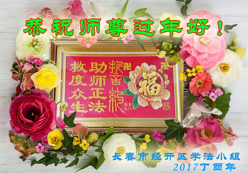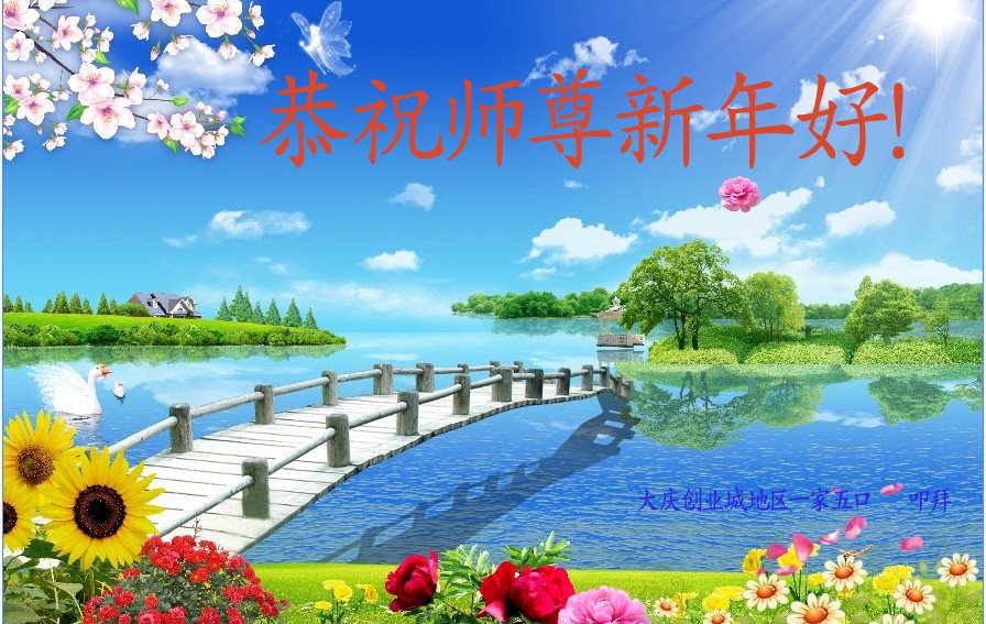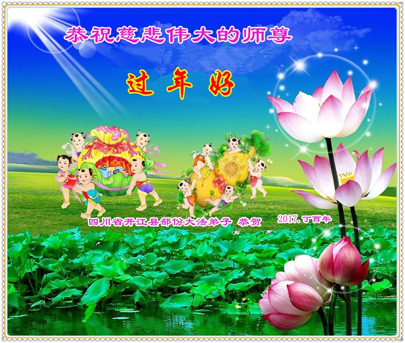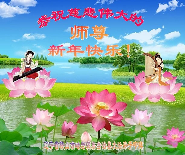 值此丁酉年新年之际,来自四川遂宁、辽宁抚顺、吉林长春、山东省威海、河北石家庄、吉林德惠、四川成都、山东招远、辽宁鞍山、湖北武汉、吉林舒兰、辽宁义县、重庆开州、湖北天门、胜利油田等七省十五地的资料点的大法弟子给慈悲伟大的李洪志师尊拜年!