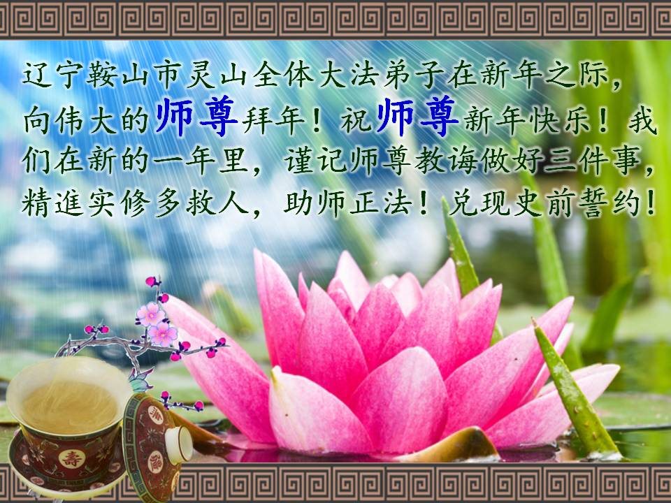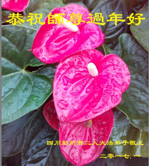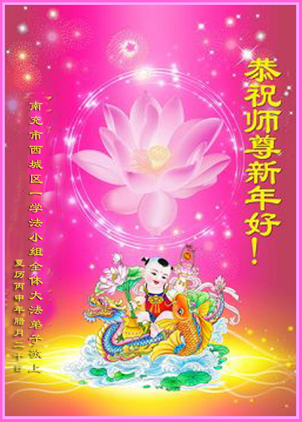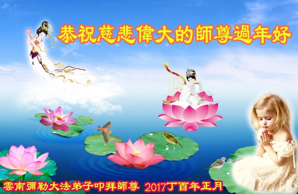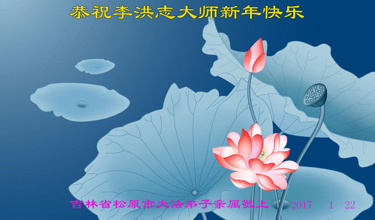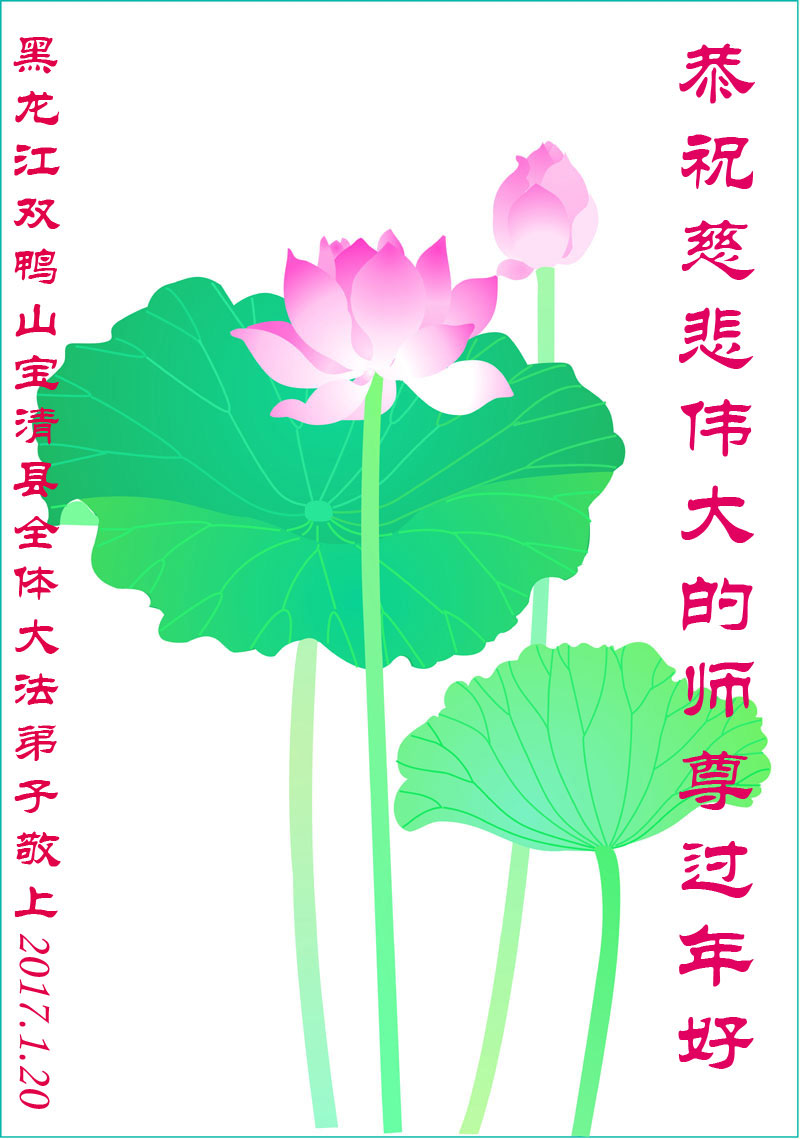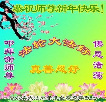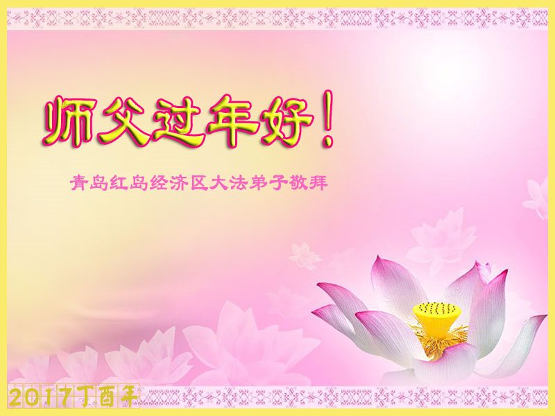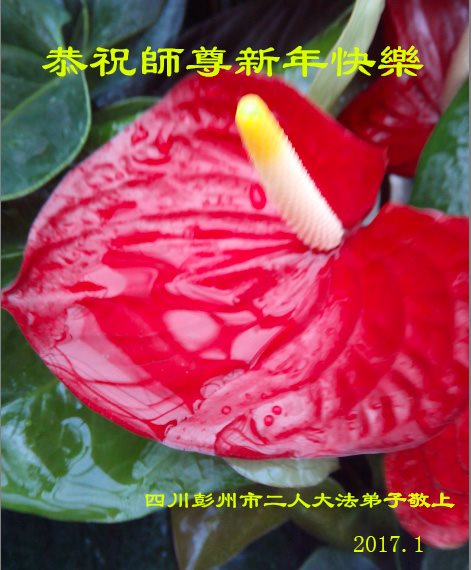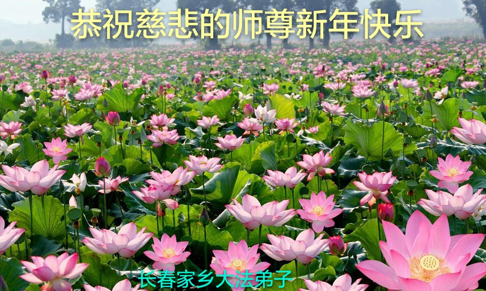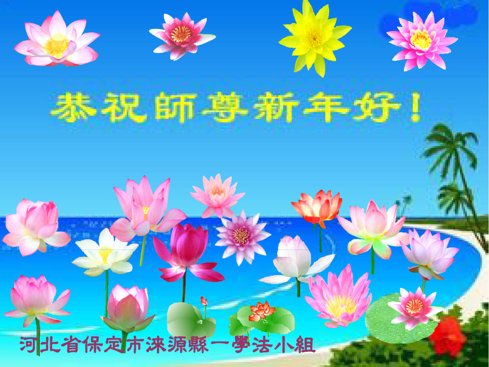值此丁酉年新年之际,来自四川遂宁、辽宁抚顺、吉林长春、山东省威海、河北石家庄、吉林德惠、四川成都、山东招远、辽宁鞍山、湖北武汉、吉林舒兰、辽宁义县、重庆开州、湖北天门、胜利油田等七省十五地的资料点的大法弟子给慈悲伟大的李洪志师尊拜年!
