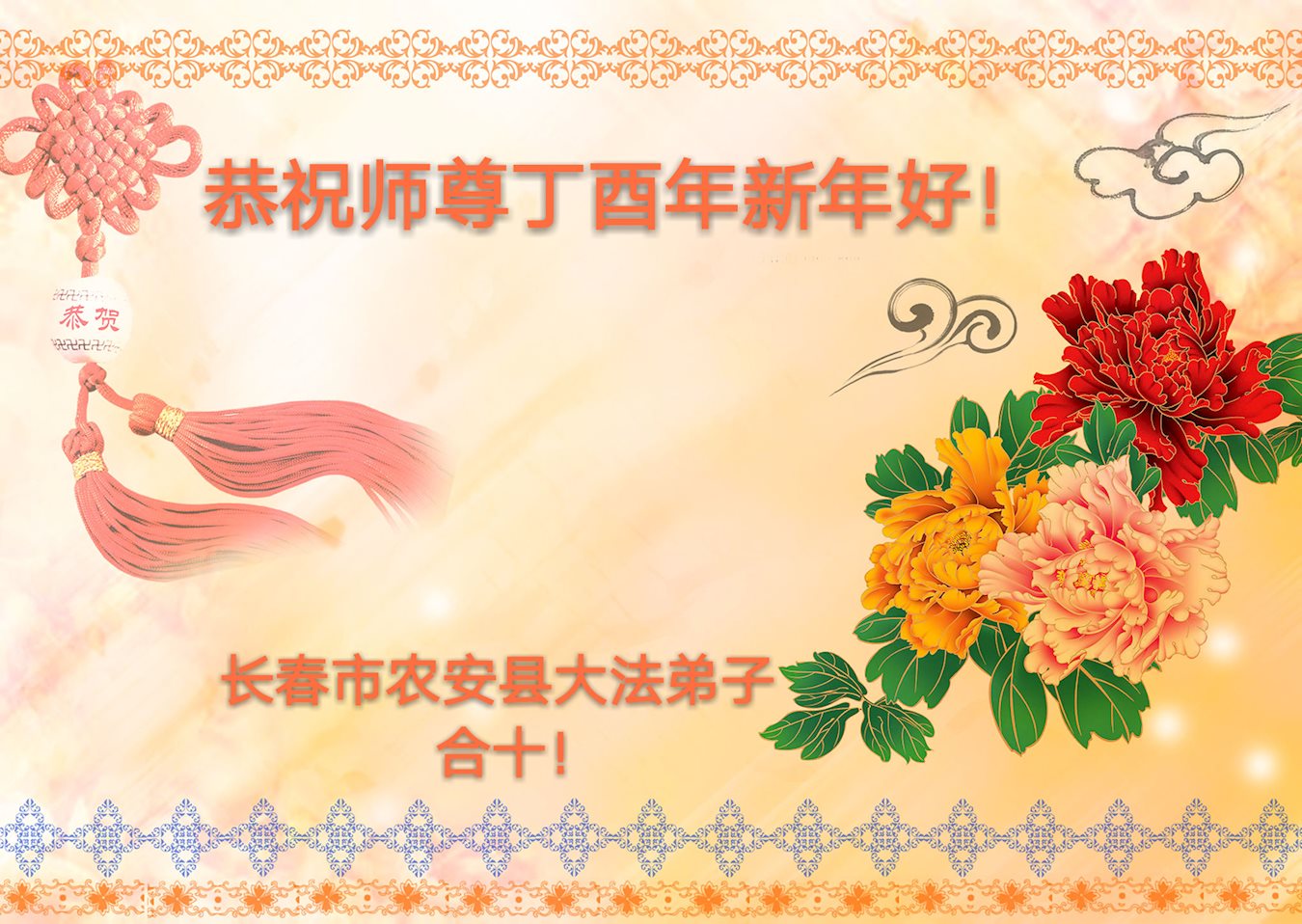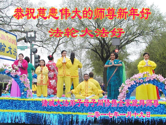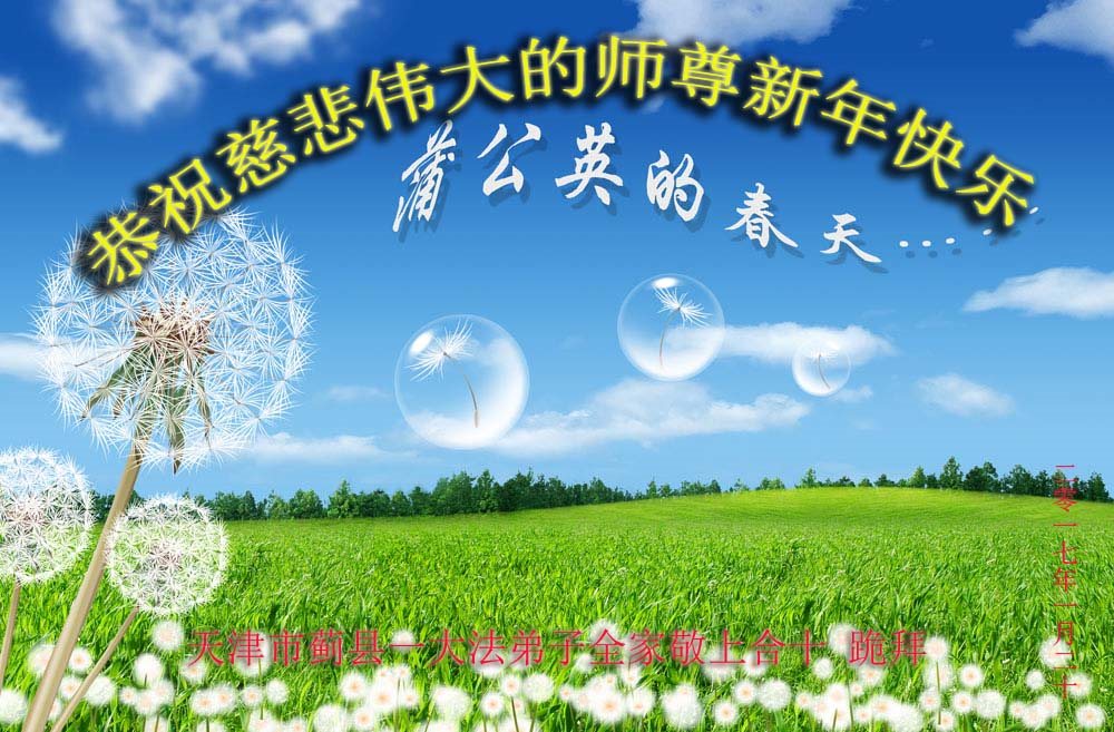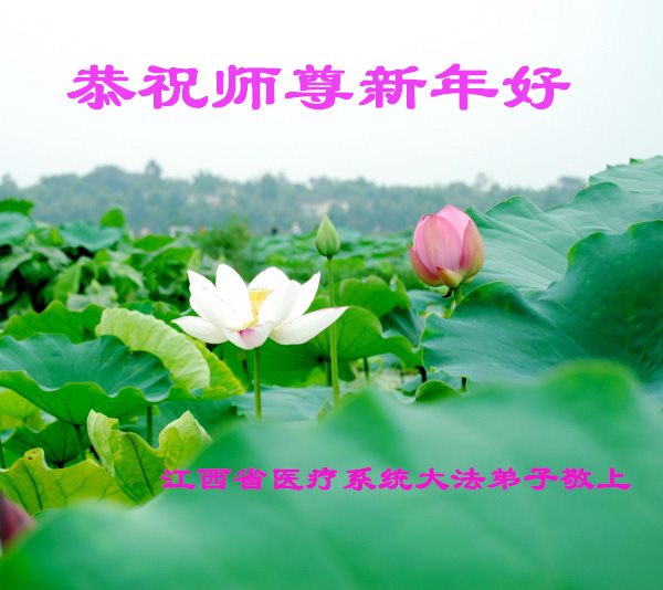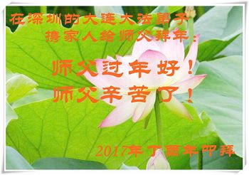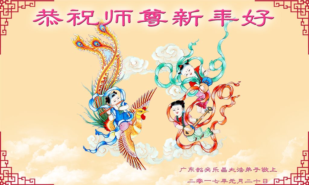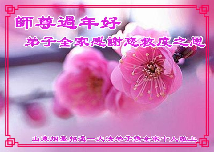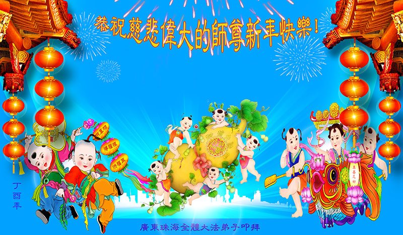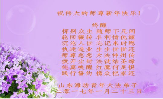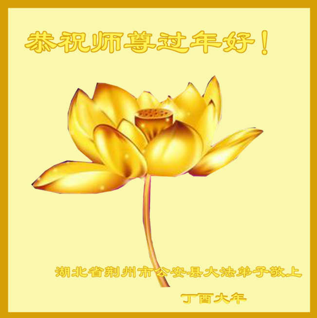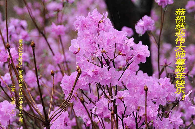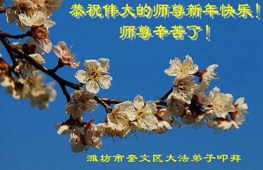 值此丁酉年新年之际,来自四川遂宁、辽宁抚顺、吉林长春、山东省威海、河北石家庄、吉林德惠、四川成都、山东招远、辽宁鞍山、湖北武汉、吉林舒兰、辽宁义县、重庆开州、湖北天门、胜利油田等七省十五地的资料点的大法弟子给慈悲伟大的李洪志师尊拜年!