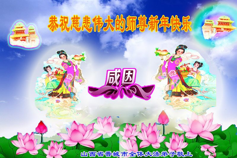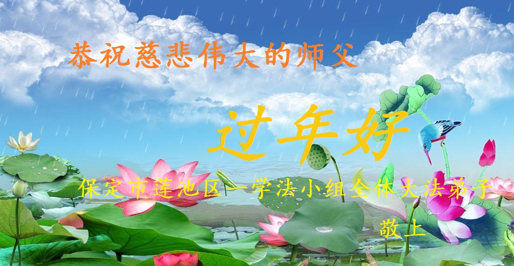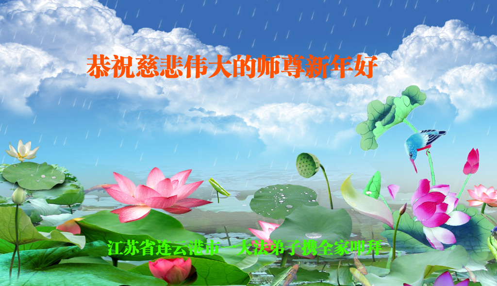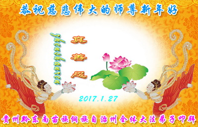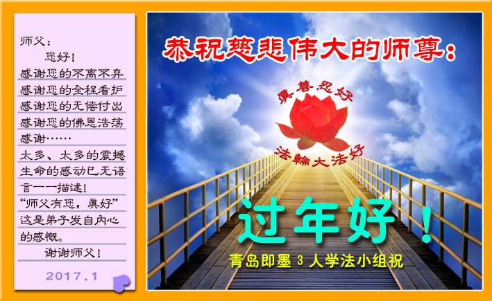 师父新年好!在师父的慈悲看护下,我们的资料点一直在发挥应有的作用,我们知道,我们能做好的每一件事情都是在师父的慈悲看护下完成的。对师父崇敬的心是用人类最美好的语言也无法表达完整的。在此新年到来之际,我们全体大法弟子用修炼人最纯净的心向师父问好!祝愿我们慈悲伟大的师父新年快乐!