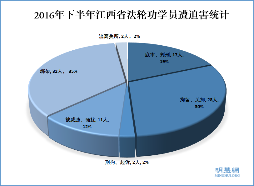 据明慧网信息,经粗略统计,2016年下半年,江西省法轮功学员遭骚扰、非法勒索、非法抓捕、非法关押、非法判刑等各种迫害,共计92人,其中11人被非法判刑,刑期一年~四年半,另有六人被非法庭审,32人被绑架,28人被拘留或关押,两人被非法起诉,11人被骚扰或威胁,有两人被迫流离失所。