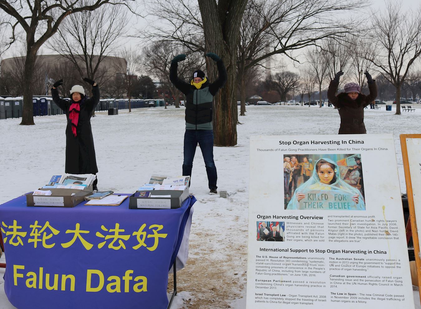 二零一七年一月七日下午,美国国家广场的大草坪被皑皑白雪覆盖,李女士在风雪中给过往的游人发法轮功真相资料,虽然穿着厚厚的棉衣,但是因为在外面站了好几个小时,她已经被寒风打透了。李女士说,她每星期都会来这里两、三天,把自己的心里话、学法轮功后的好处、在中国大陆共产党迫害法轮功的事情告诉游客。