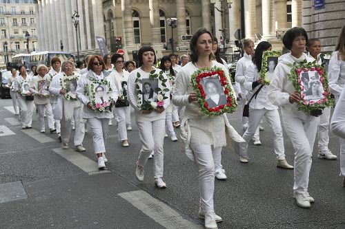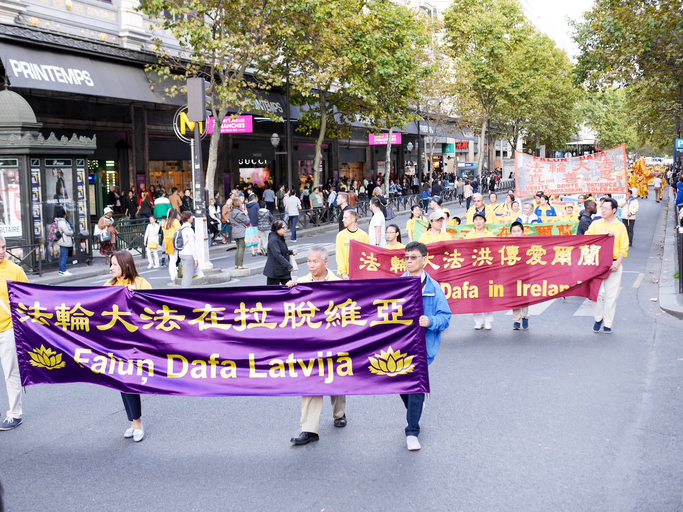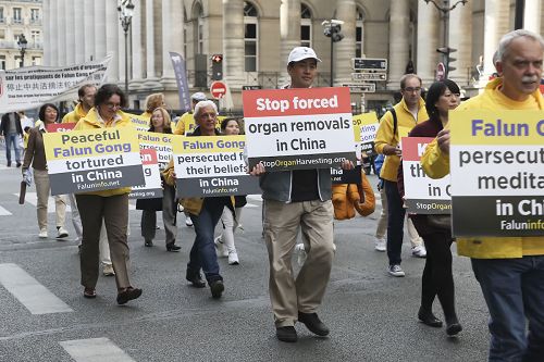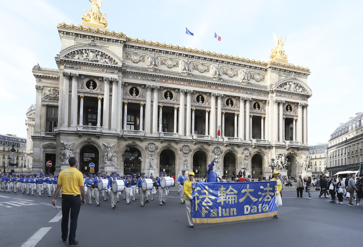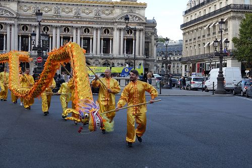 【明慧网二零一七年十月一日】(明慧记者德祥、德龙法国巴黎报道)二零一七年九月三十日下午五点,来自欧洲三十一个国家一千三百余名法轮功学员聚集在法国首都巴黎市中心 Place de la Bourse广场,拉开了大游行的序幕,游行队伍中包括《天国乐团》、腰鼓队、舞龙队、仙女队和功法表演,展现了法轮大法的美好。同时游行呼吁人们共同制止中共对法轮功长达十八年的迫害,包括手持被中共迫害致死的法轮功学员照片的队伍、揭露中共活体摘取法轮功学员器官的方阵以及退出中共。