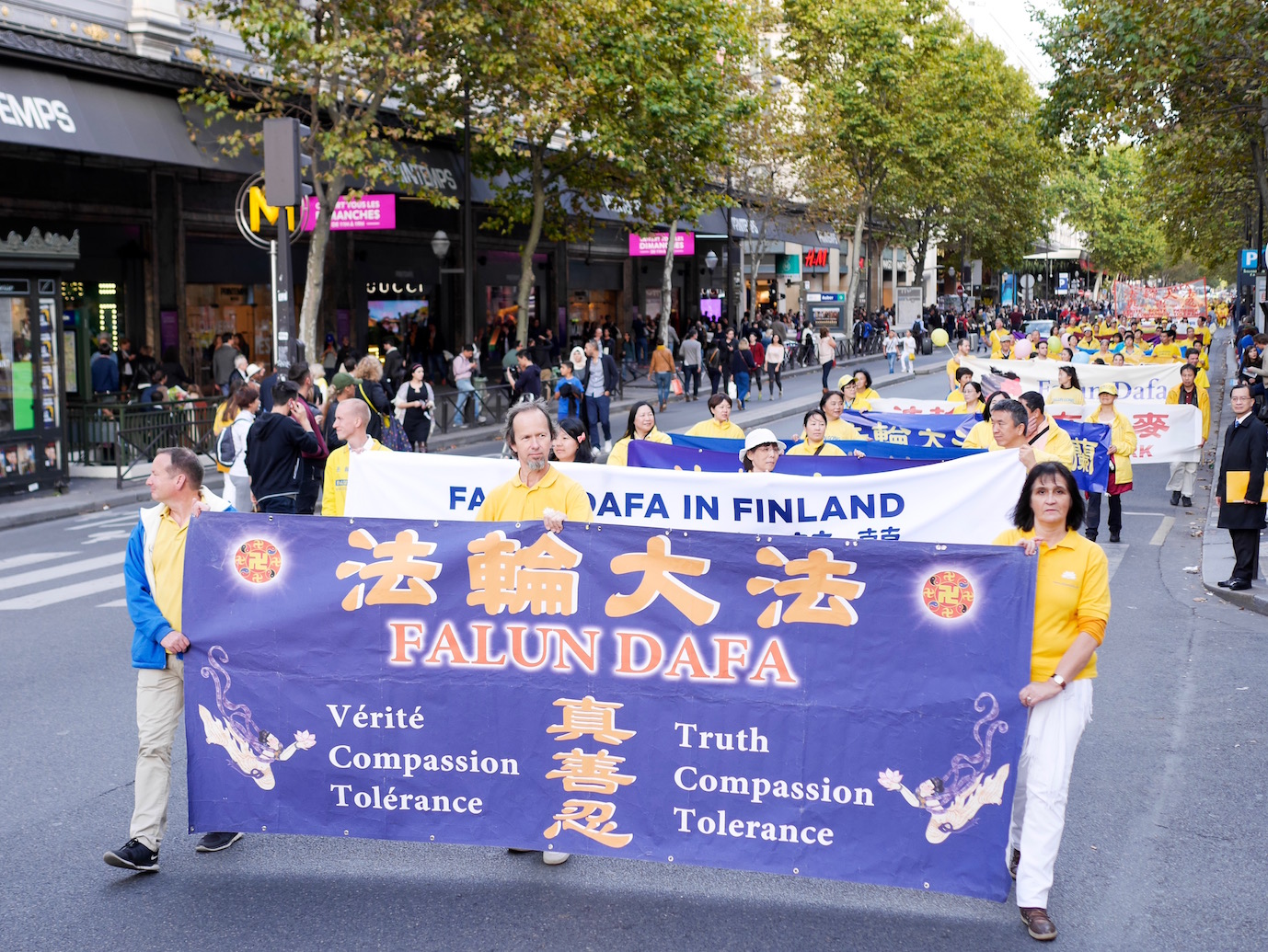 法国前教育部长Françoise Hostalier女士走在游行队伍最前端,与法轮功学员一起走完全程。游行结束时, Hostalier女士表示非常感谢来自欧洲各国的法轮功学员到巴黎的参加大游行。